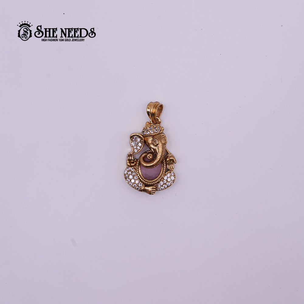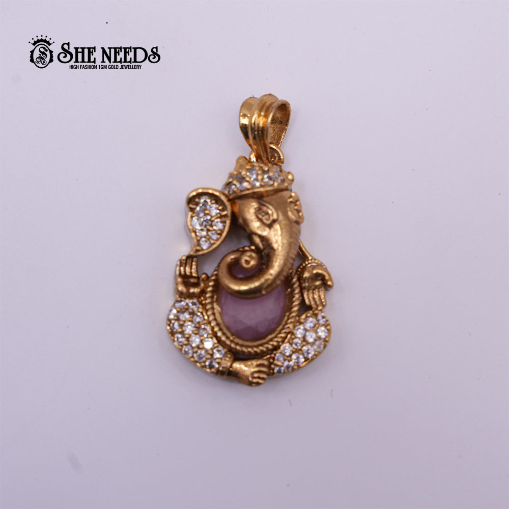 Embrace divine elegance with this intricately crafted Ganesha pendant from She Needs. Made with high-quality 1GM gold-plated material, this pendant features a beautifully detailed Lord Ganesha adorned with sparkling CZ (Cubic Zirconia) stones and a central semi-precious stone that adds a touch of grace and sophistication. Ideal for daily wear or festive occasions, it is a timeless piece that brings both style and spiritual charm.