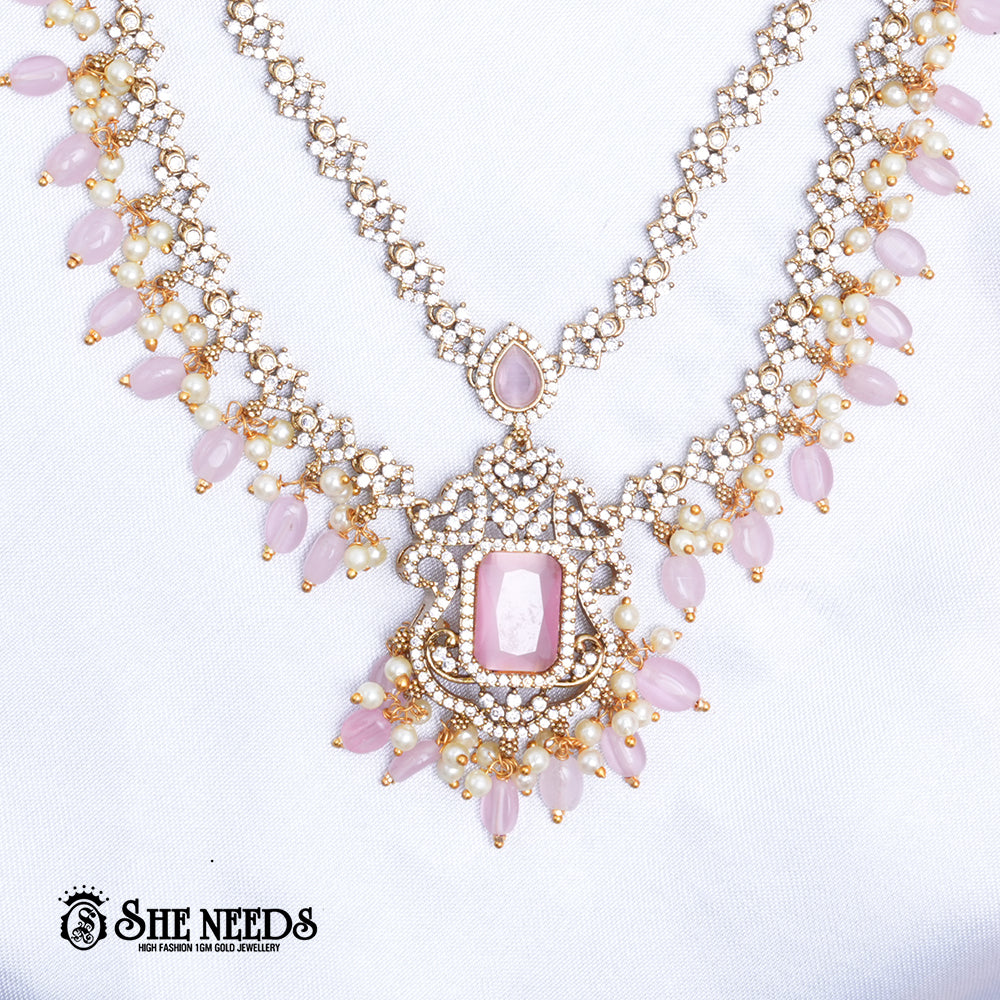- Features: Dual chains, large pink pendant, pearl and blush bead fringe, designer matching earrings