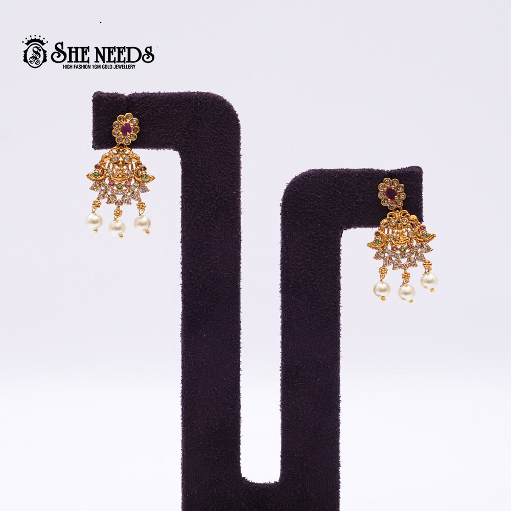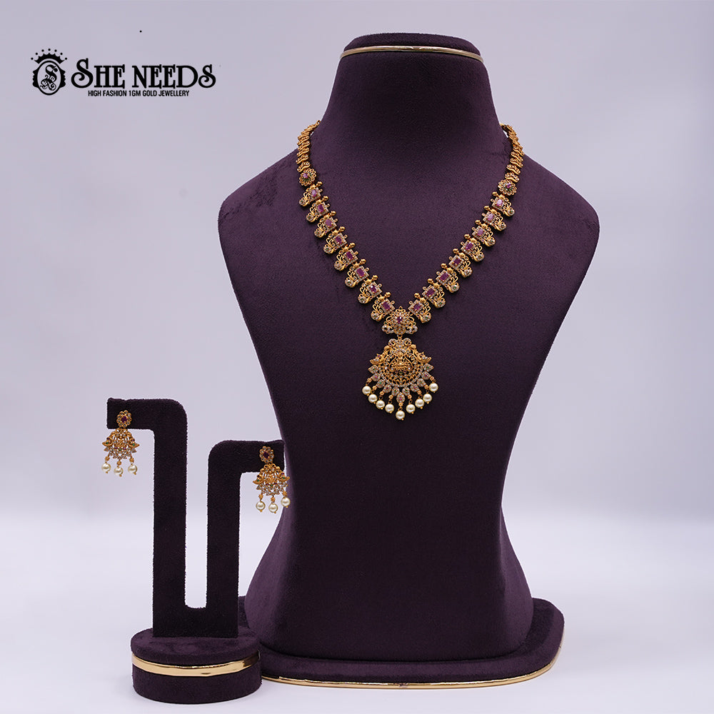 Crafted in elegant 1gm gold plating, this necklace set showcases a graceful blend of floral motifs, shimmering AD stones, and pearl detailing. A timeless design perfect for adding charm to any traditional outfit.