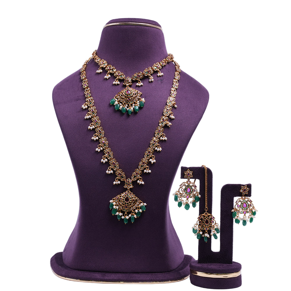 The Majestic Emerald Royal Necklace Set is a striking blend of grandeur and traditional artistry. With its antique gold filigree patterns, vibrant emerald-green drops, and delicate pearl accents, this masterpiece creates a statement of royalty. Designed for brides, festive occasions, and cultural celebrations, it beautifully enhances your ethnic attire with a regal touch.