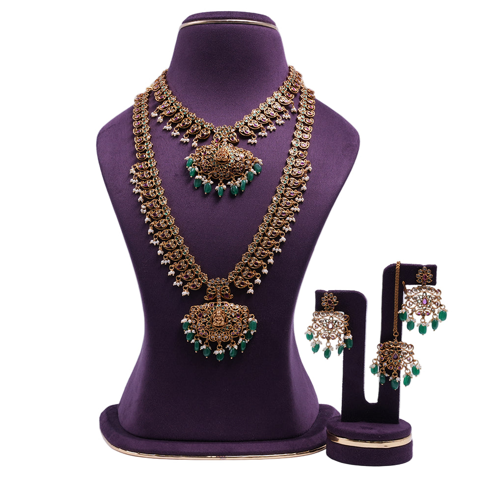 The Royal Peacock Temple Necklace Set embodies heritage, artistry, and divine elegance. Highlighting the intricately crafted peacock motif, this antique gold masterpiece is adorned with emerald-green drops and delicate pearls that enhance its regal charm. Designed for weddings, festivals, and temple occasions, this set adds a touch of grandeur and cultural richness to your traditional look.