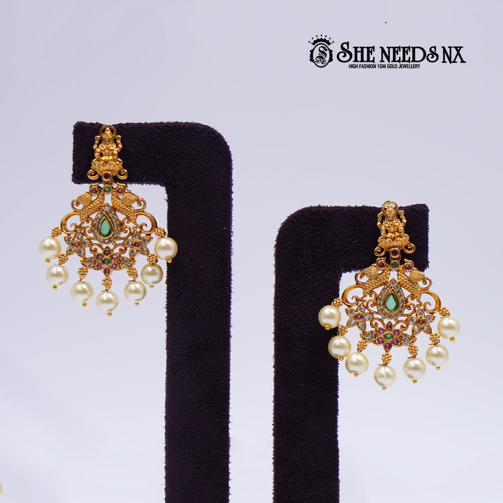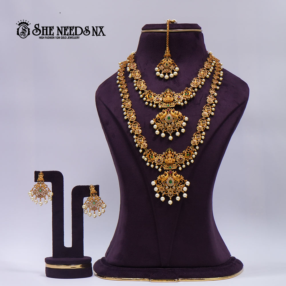 Celebrate timeless tradition with this triple-layered temple necklace set, showcasing regal peacock motifs and goddess engravings. Embellished with green teardrop stones and pearl drops, this 1gm gold-finish set is perfect for the grandest of occasions.