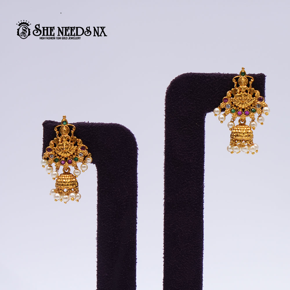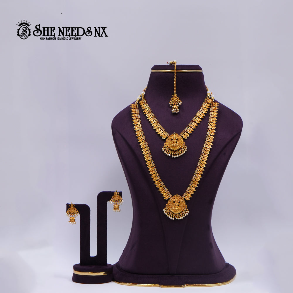 A divine masterpiece in 1gm gold finish, this traditional two-layered necklace set features intricate temple motifs, studded with colorful stones and adorned with pearl drops. The central goddess Lakshmi pendant adds a spiritual elegance, making it a perfect choice for religious ceremonies and bridal occasions.