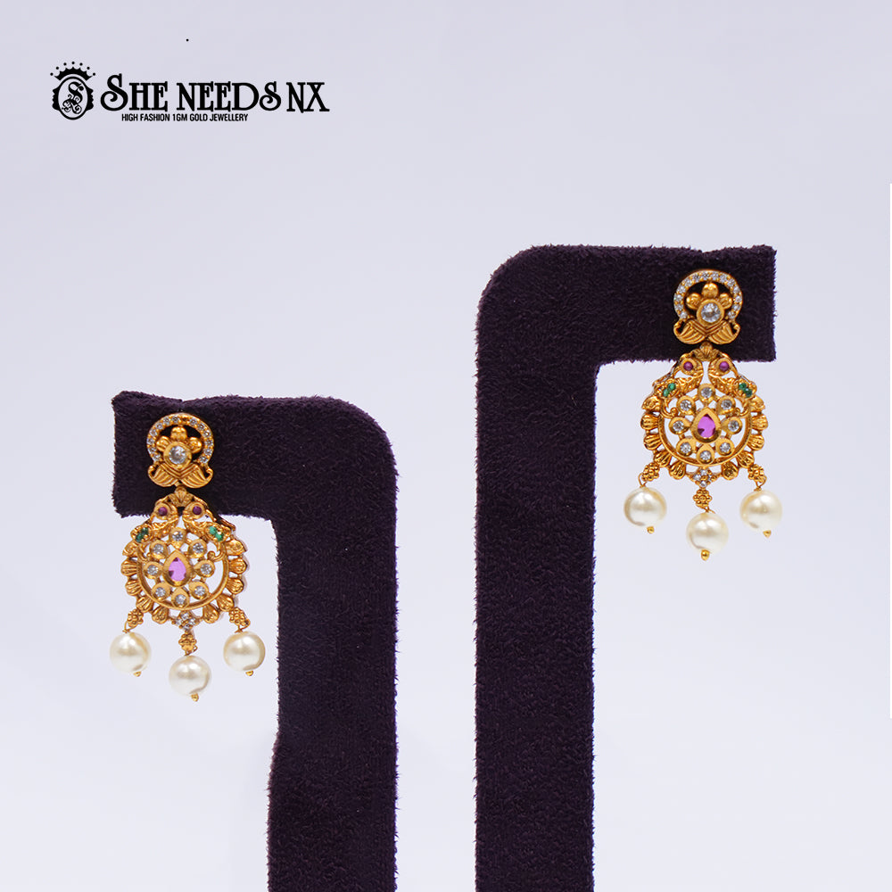A charming pair of AD-studded drop earrings, showcasing floral-inspired motifs and elegant hanging pearls. Lightweight yet regal, these earrings enhance your ethnic attire with a graceful sparkle.