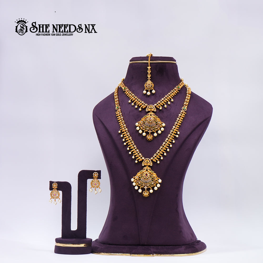 An opulent layered necklace set featuring intricate craftsmanship in a 1gm gold finish, this piece blends traditional charm with modern elegance. Designed with detailed AD embellishments and finished with lustrous pearl drops, it’s ideal for bridal wear or grand festive occasions.