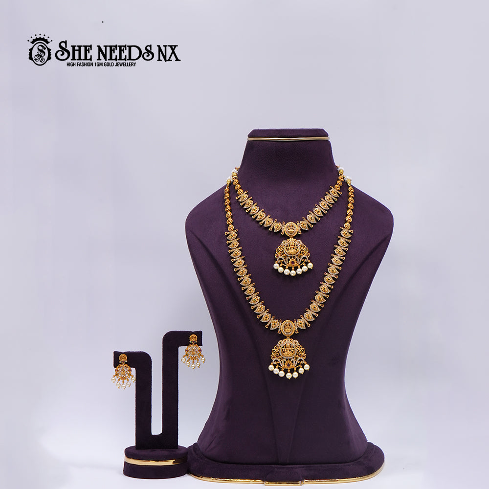 Exude timeless elegance with this regal necklace set crafted in exquisite 1gm gold finish. The design showcases a harmonious blend of intricate Kundan-style motifs and luxurious detailing, perfect for adding royal grandeur to bridal and festive ensembles. Finished with delicate pearl hangings and a stunning central pendant, this double-layered set elevates any traditional look.