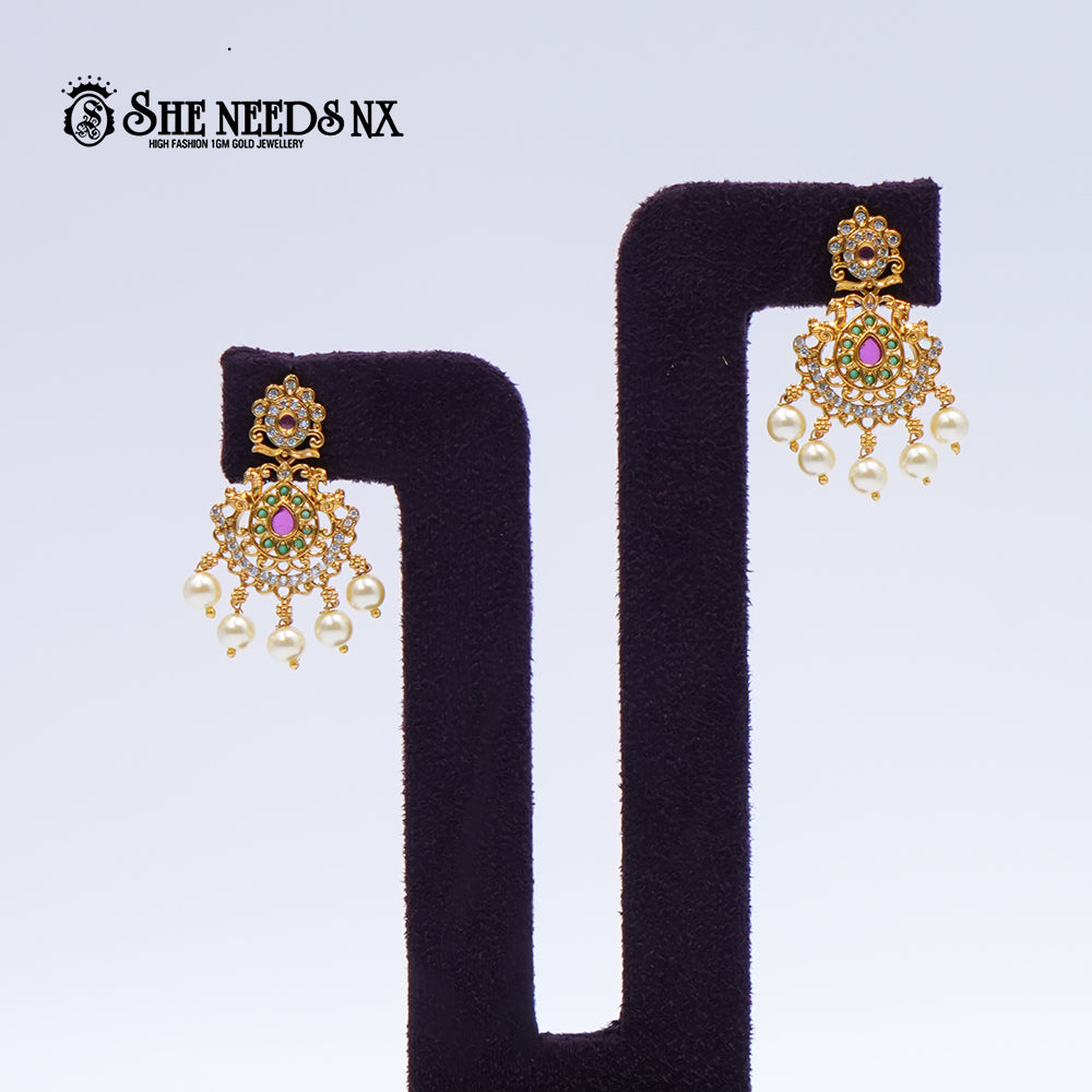 These graceful drop earrings exude timeless temple charm with a modern twist. Featuring a two-part floral design centered around a teardrop pink stone and surrounded by AD highlights, the earrings are completed with dainty pearl danglers that move with elegance.