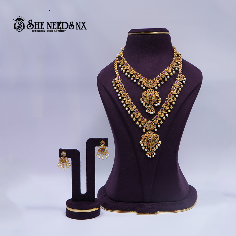 Crafted for the discerning bride, this double-layered necklace set embodies the splendor of traditional temple artistry. Finished in radiant 1gm gold, the design showcases intricate floral motifs studded with AD stones and crowned with bold central pendants. The pearl droplet accents add a divine charm, making this piece perfect for grand wedding looks and cultural festivities.