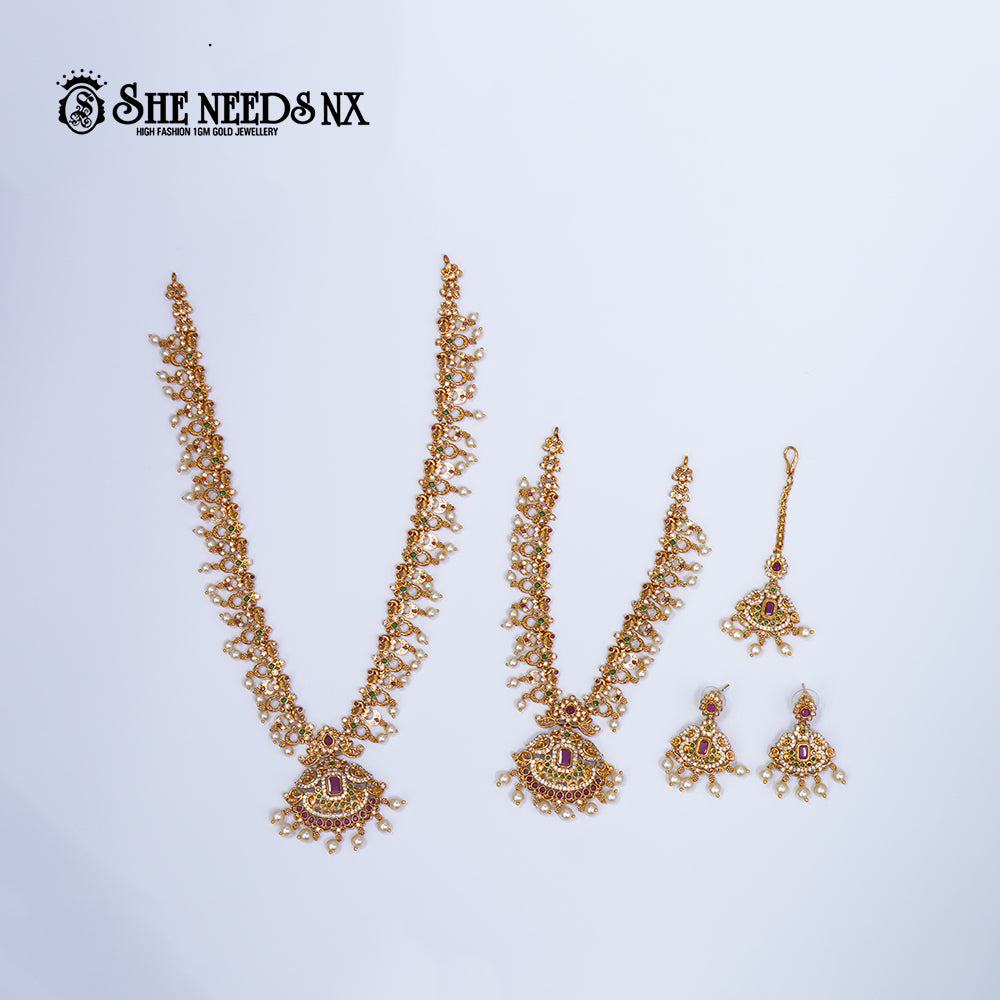 This majestic bridal set reflects the essence of heritage with its handcrafted detailing and traditional motifs. Designed in a rich 1gm gold finish, the set includes a long necklace, short necklace, matching earrings, and a maang tikka. Adorned with ruby-pink rectangular stones, pearl danglers, and intricate green accents, it exudes vintage grandeur—ideal for traditional bridal attire or festive ethnic looks.