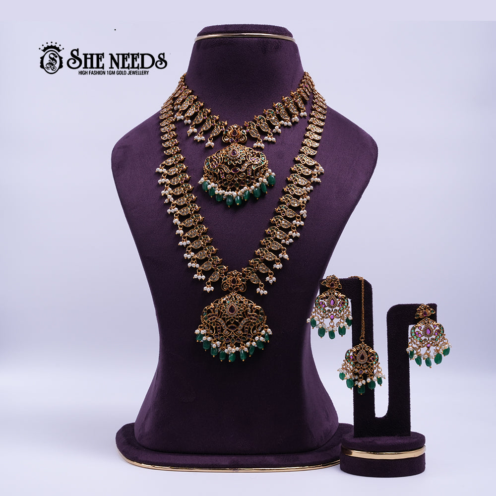 The Emerald Grace Bridal Necklace Set radiates opulence with its antique gold finish and regal charm. Adorned with intricately carved patterns, the set features two layered necklaces, each centered with a grand medallion encrusted with green beads, pearls, and shimmering stones. Designed for weddings and grand festivities, this masterpiece adds a touch of royal splendor to any bridal or festive attire. The set is beautifully paired with coordinated earrings and a maang tikka for a complete ethnic statement.