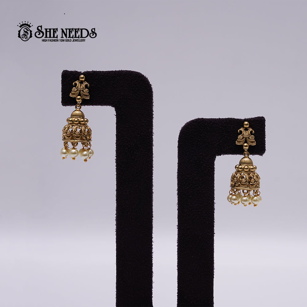 Classic jhumka earrings featuring traditional dome-shaped design, adorned with delicate motifs and pearl danglings, perfect for timeless ethnic looks.