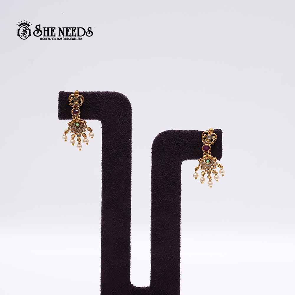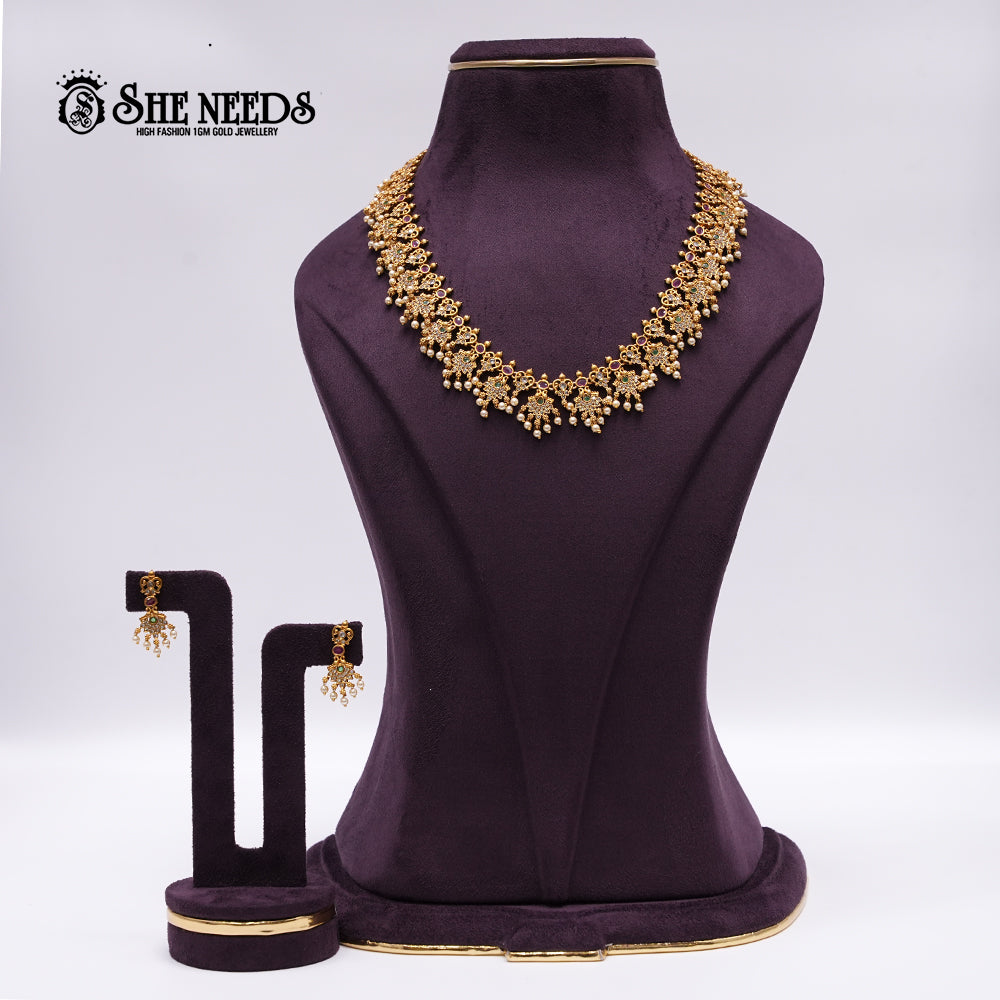 A timeless 1gm gold necklace set with traditional temple-inspired motifs, finished with pearl bead drops and multicolor accents for a rich ethnic aesthetic.