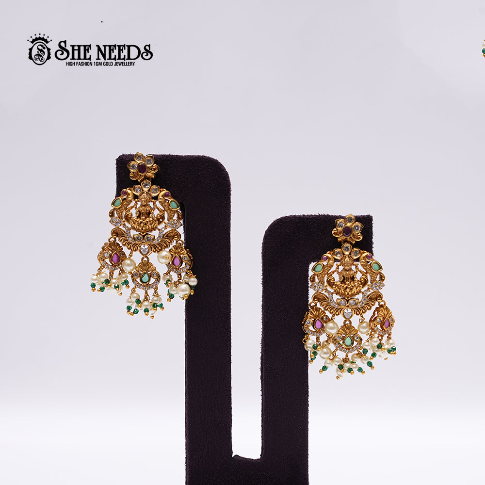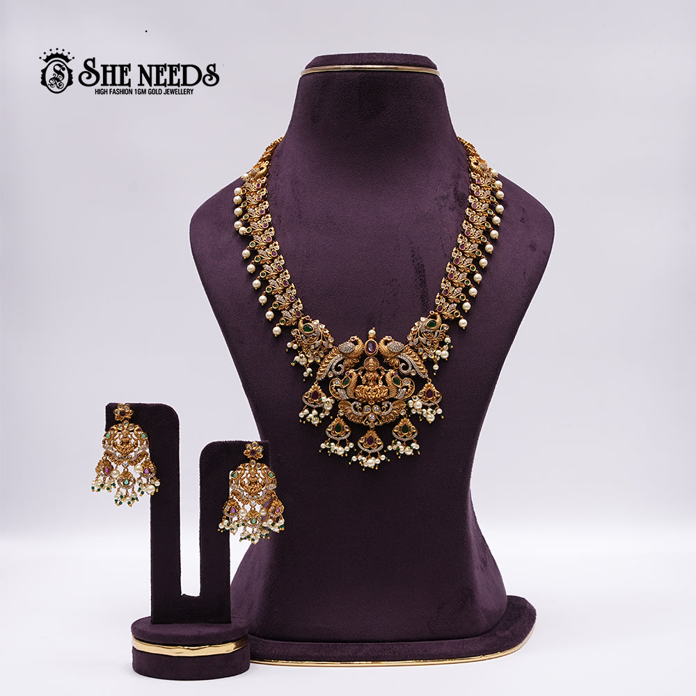 An opulent temple-style necklace set with peacock detailing and Lakshmi pendant, adorned with premium stones and intricate craftsmanship. This majestic 1gm gold set is designed to add grandeur to your traditional attire.