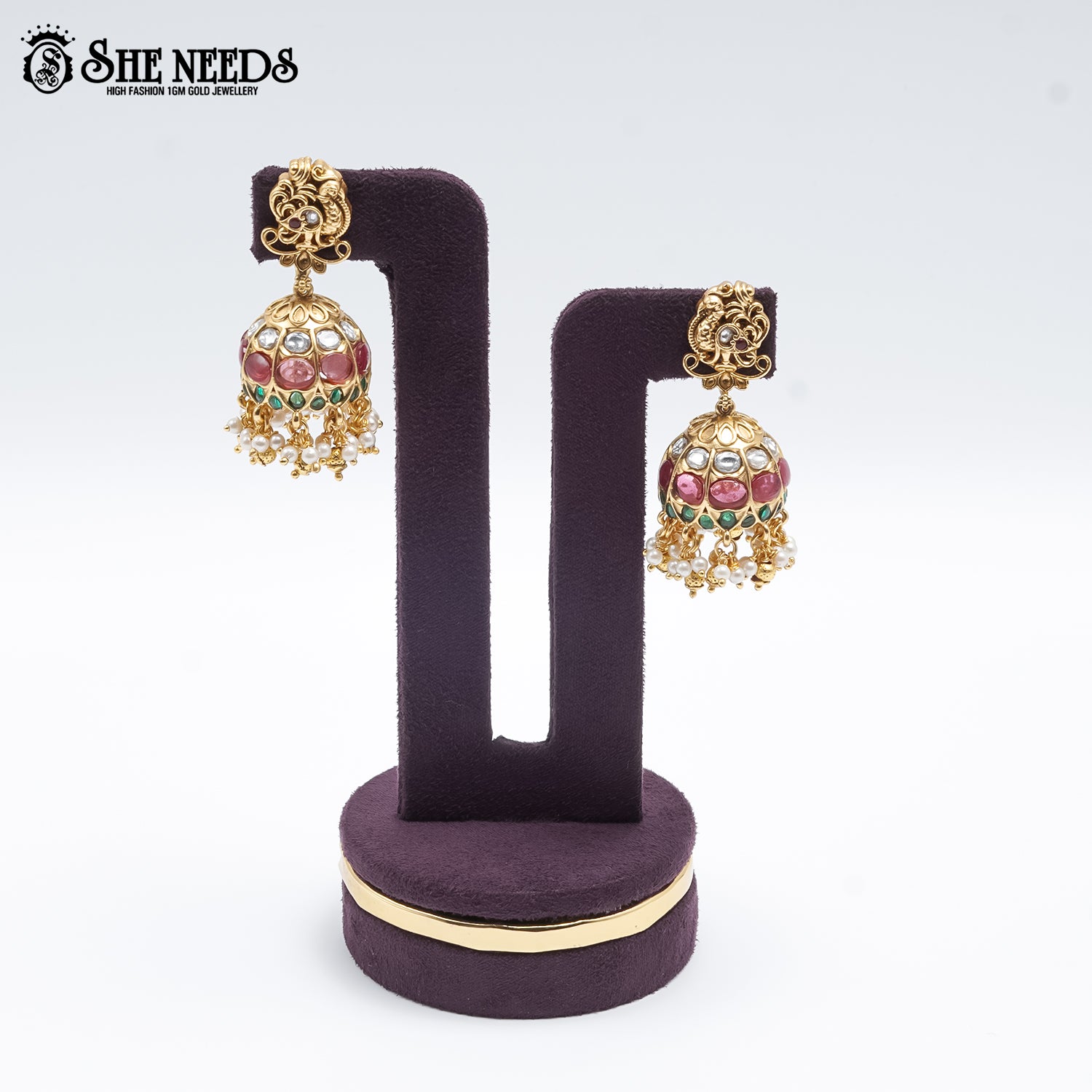 These exquisite earrings combine traditional kundan work with vibrant green and ruby tones. The delicate dome-shaped design and cluster pearl drops lend a regal charm to any look. Wear them solo or pair with the necklace set for full impact.