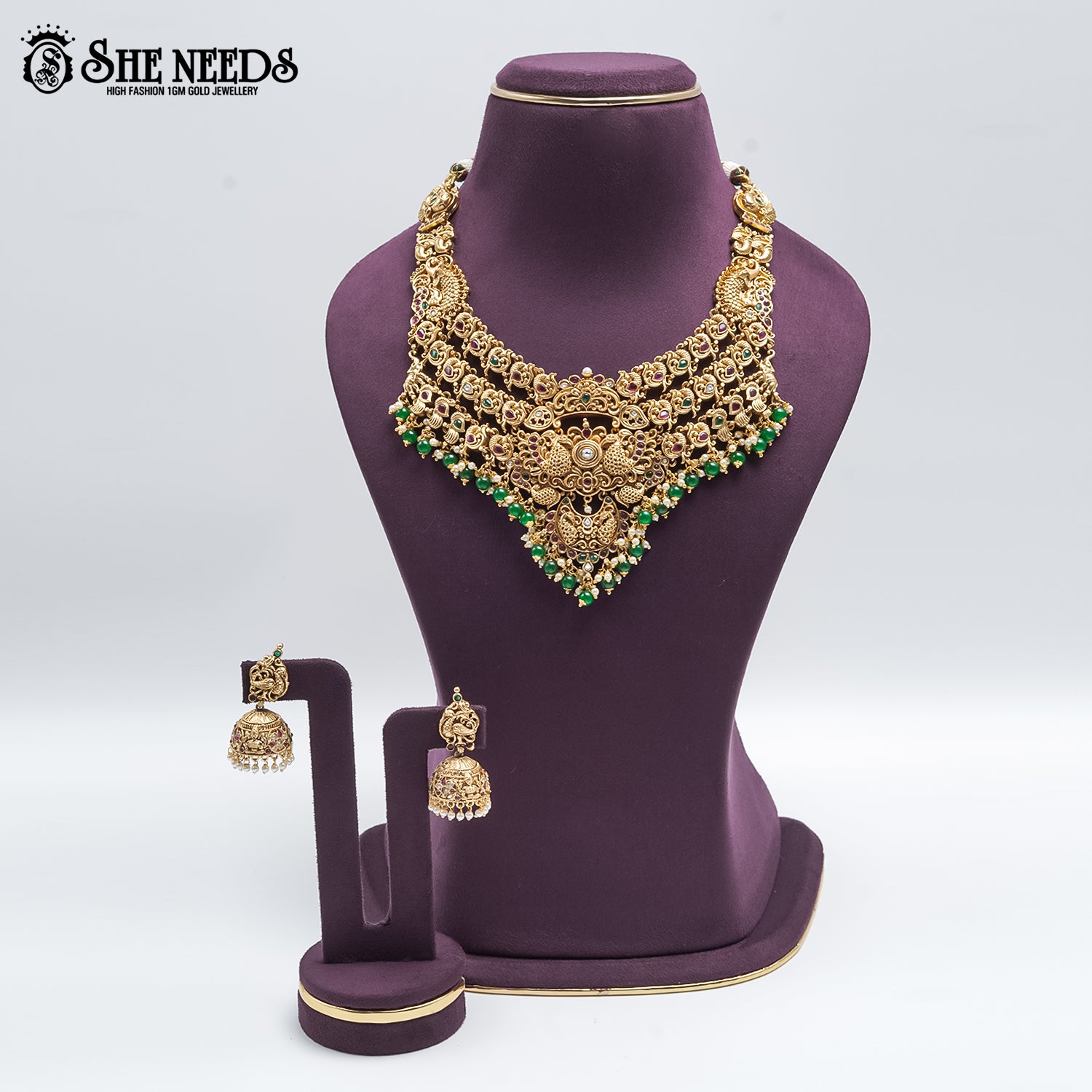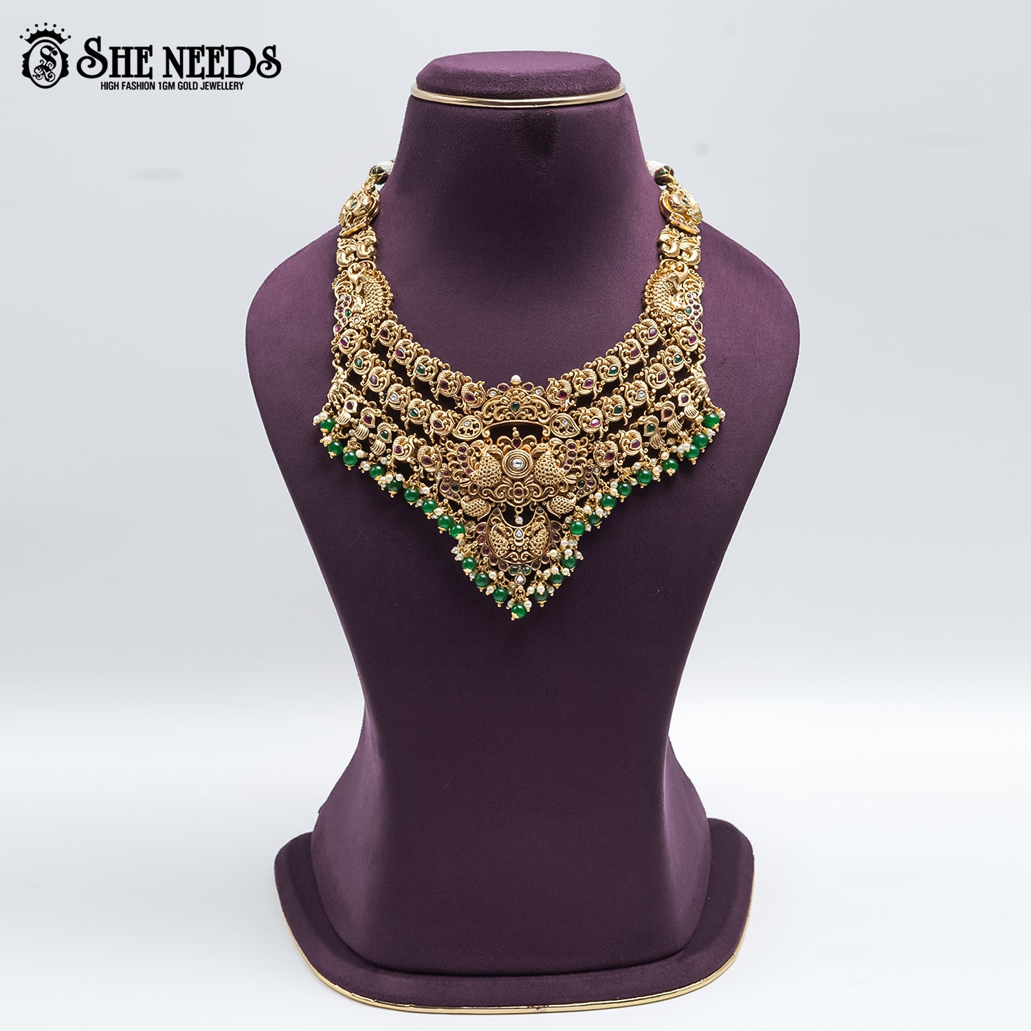 Step into a world of timeless tradition with this grand temple-style necklace. Featuring intricate goddess motifs, layered gold craftsmanship, and hints of ruby and emerald accents, this regal piece is perfect for making a bold statement. The green bead droppings add a graceful edge, while its lightweight structure ensures all-day elegance.
