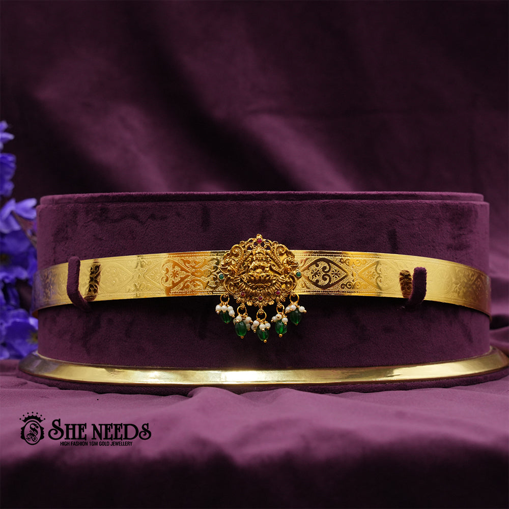 This vaddanam features a slim gold-finish belt with intricate etched floral detailing, highlighted by a small central Lakshmi medallion. The pendant is accented with pink and green stonework. Dangling from the center are clusters of emerald green beads and white pearls, creating a refined traditional look. Its minimalist style is ideal for kids, light occasions, or a delicate ethnic accent.