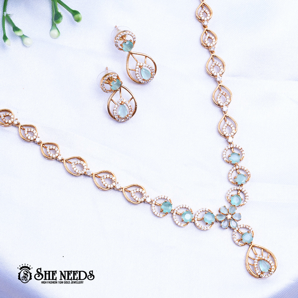 Gracefully entwined, teardrop loops and soft mint stones dance together in this sophisticated necklace set, ideal for understated elegance at every celebration. Its airy silhouette and subtle sparkle make this the perfect touch for modern traditional looks.