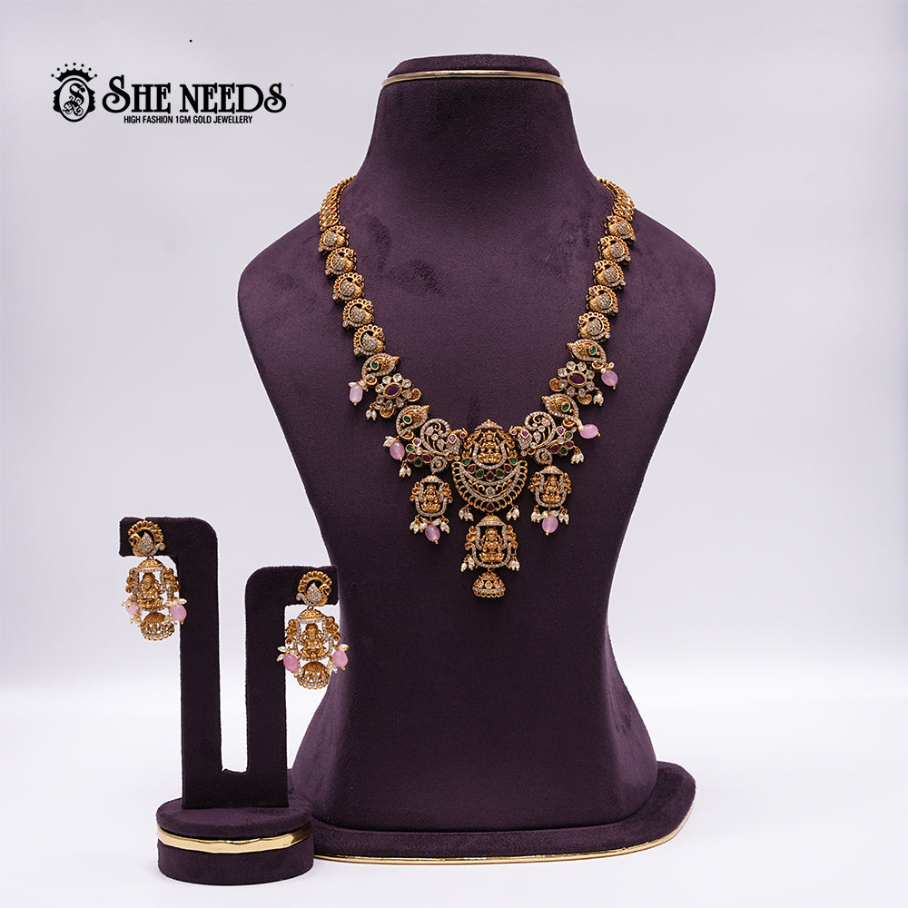 A majestic temple-style necklace set inspired by traditional South Indian heritage. Featuring detailed Goddess Lakshmi motifs, American diamonds, and pink bead drops for a regal ethnic charm.