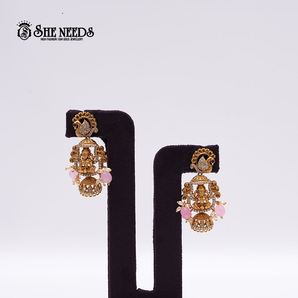 Traditional South Indian temple earrings with intricate Lakshmi designs, adorned with dazzling AD stones and pink bead droplets to complement ethnic and festive outfits.