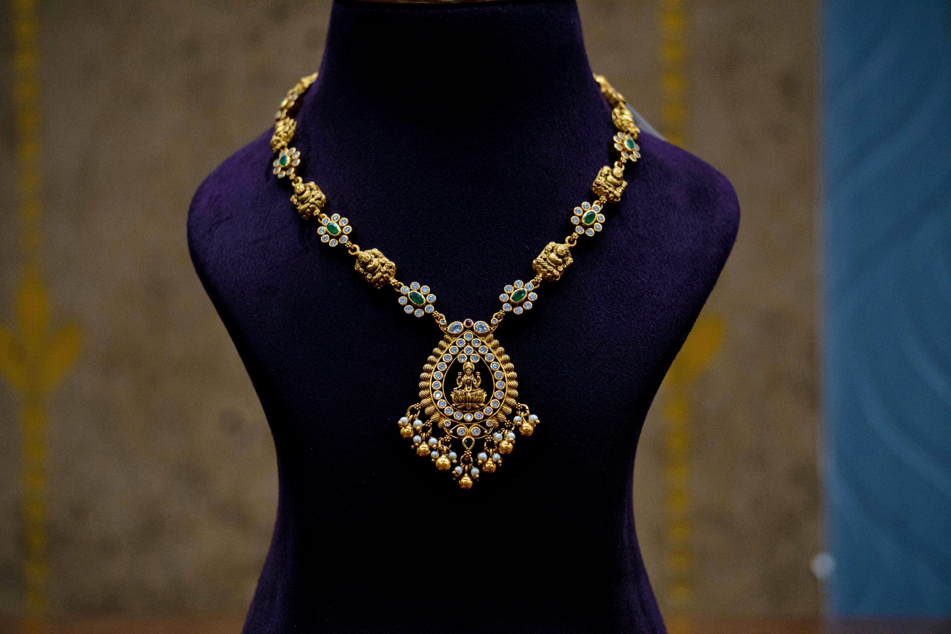 Bring timeless tradition to your jewellery collection with this intricately designed Temple Necklace. Featuring a beautifully sculpted Lakshmi Devi pendant adorned with shimmering blue and green stones, this piece reflects the richness of South Indian craftsmanship