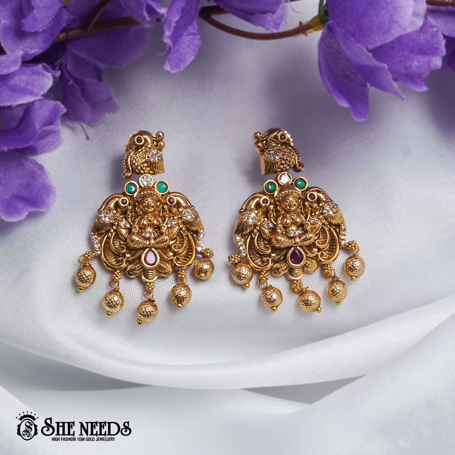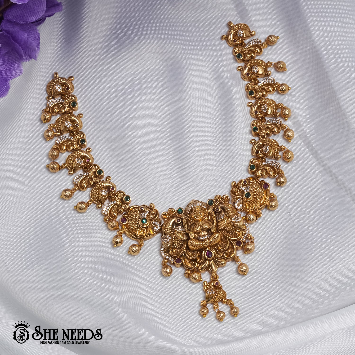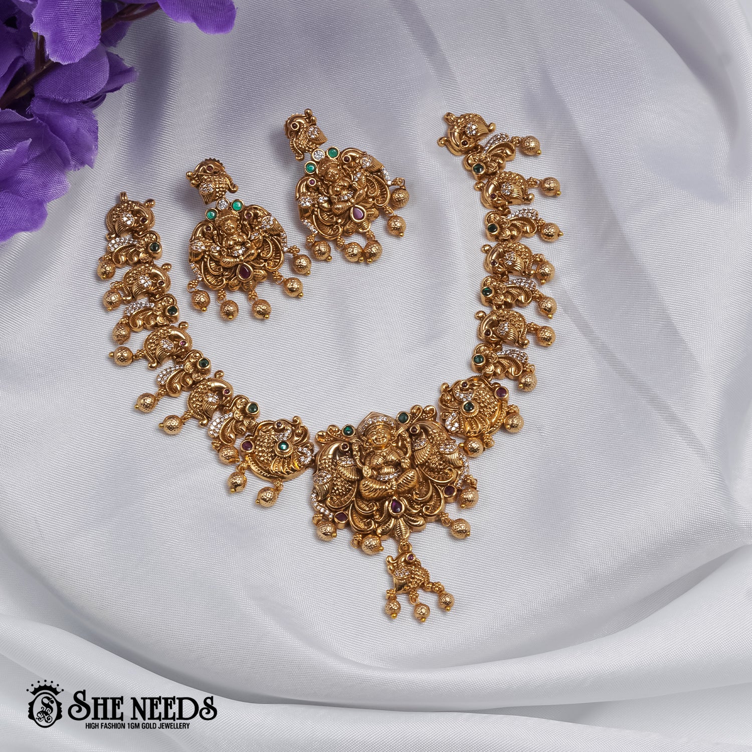 Product Name: Lakshmi Temple Necklace Set with Earrings – 1gm Gold Finish