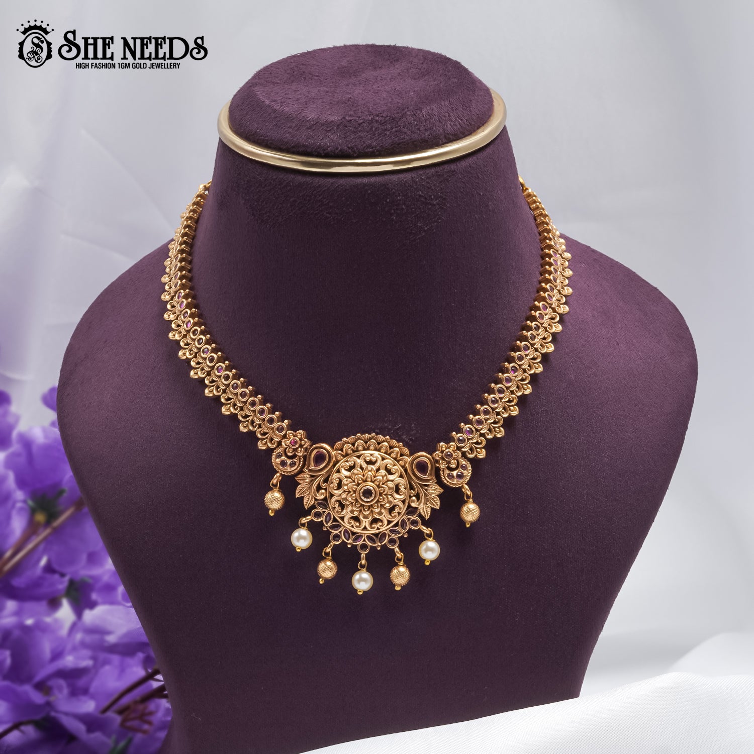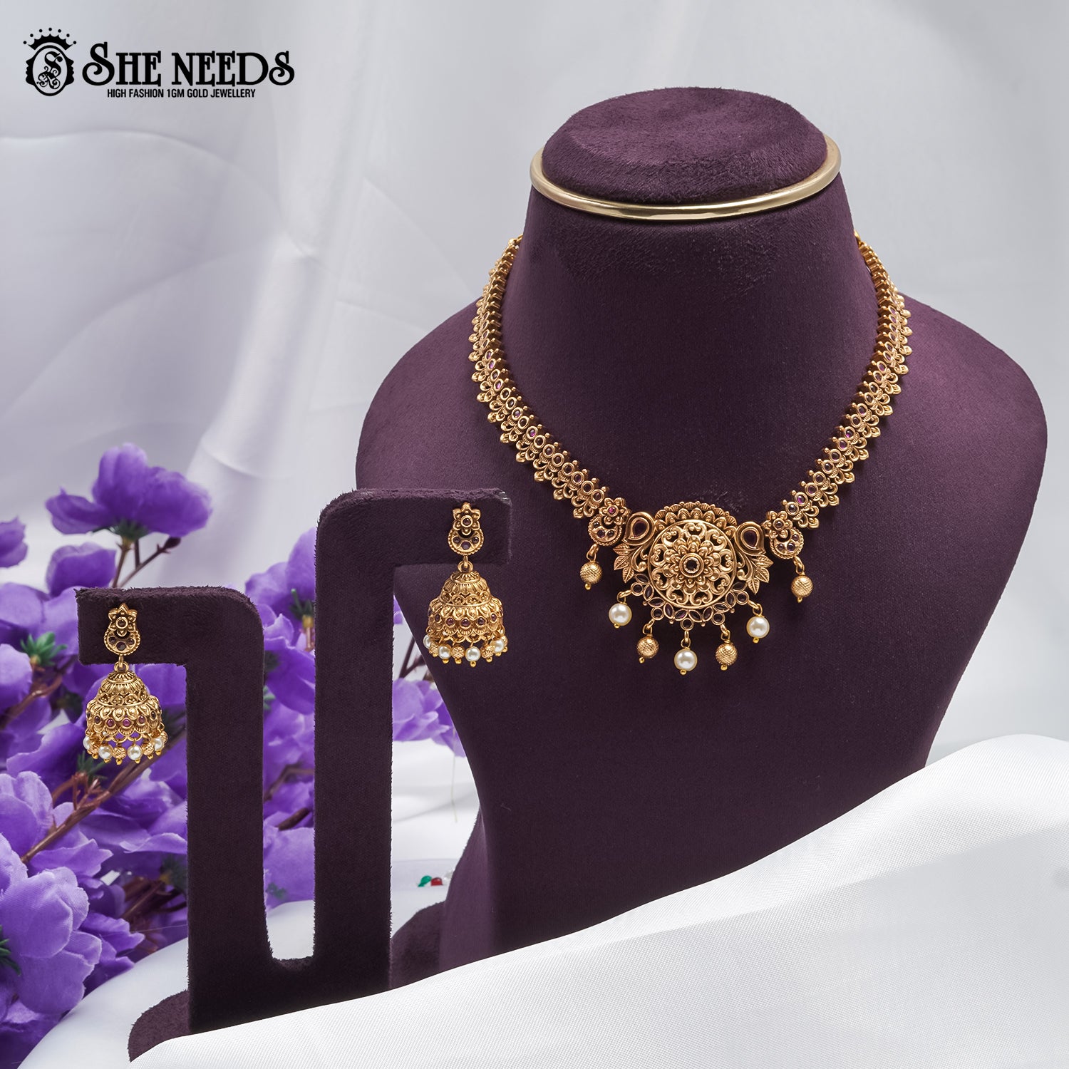 Emanating timeless elegance, the Royal Lotus Pearl Necklace Set is an ode to floral symmetry and classic Indian design. The antique gold-toned necklace features a mesmerizing circular lotus motif at its center, accented with dangling pearls and rich golden beadwork. Ideal for festive occasions and traditional gatherings, the set includes a delicately coordinated pair of jhumka-style earrings that embody old-world charm.
