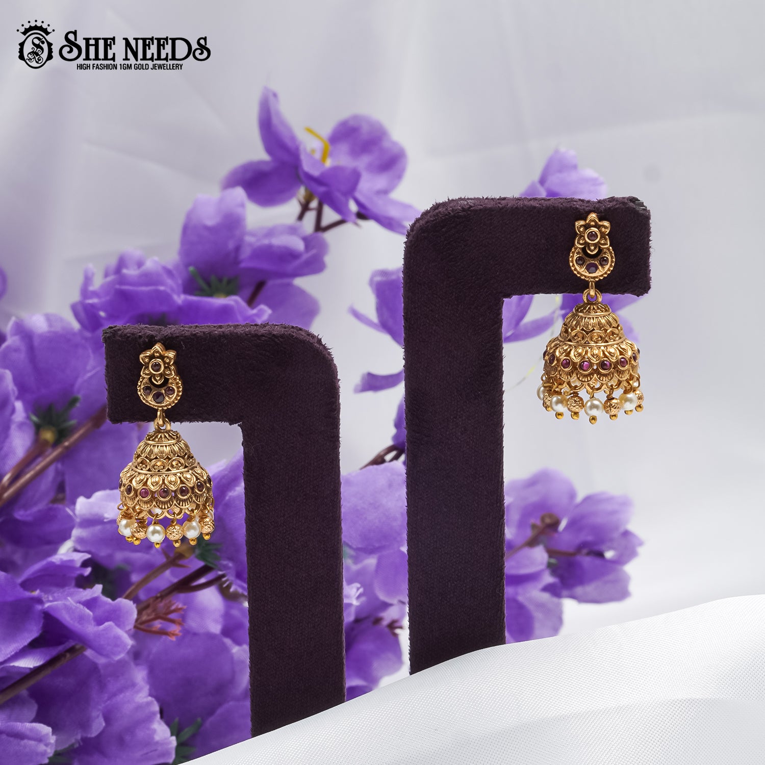 Complementing the necklace beautifully, the Royal Lotus Pearl Jhumka Earrings reflect regal splendor with their dome-shaped artistry and intricate detailing. Crafted in antique gold with hints of deep purple stones and finished with delicate pearl hangings, these earrings are a statement of tradition and grace.