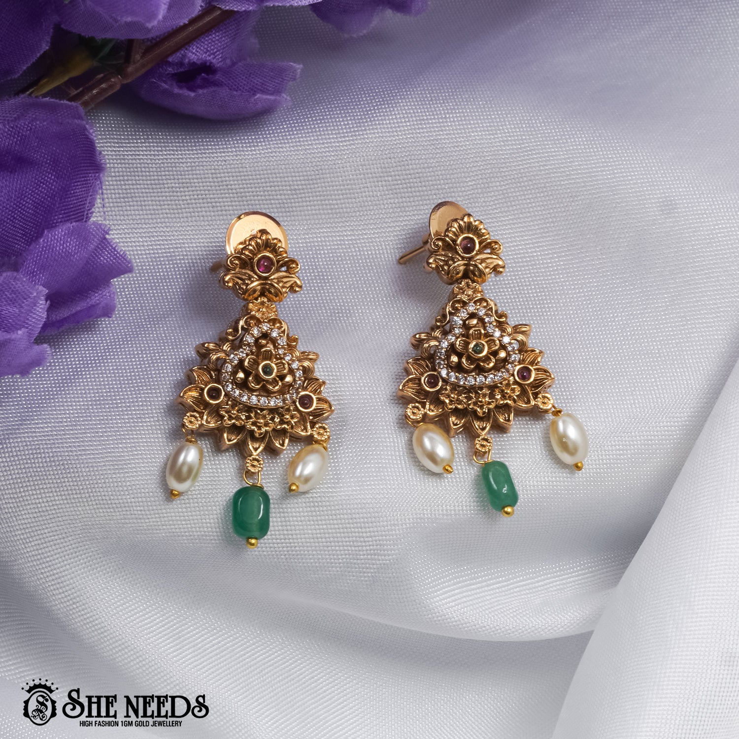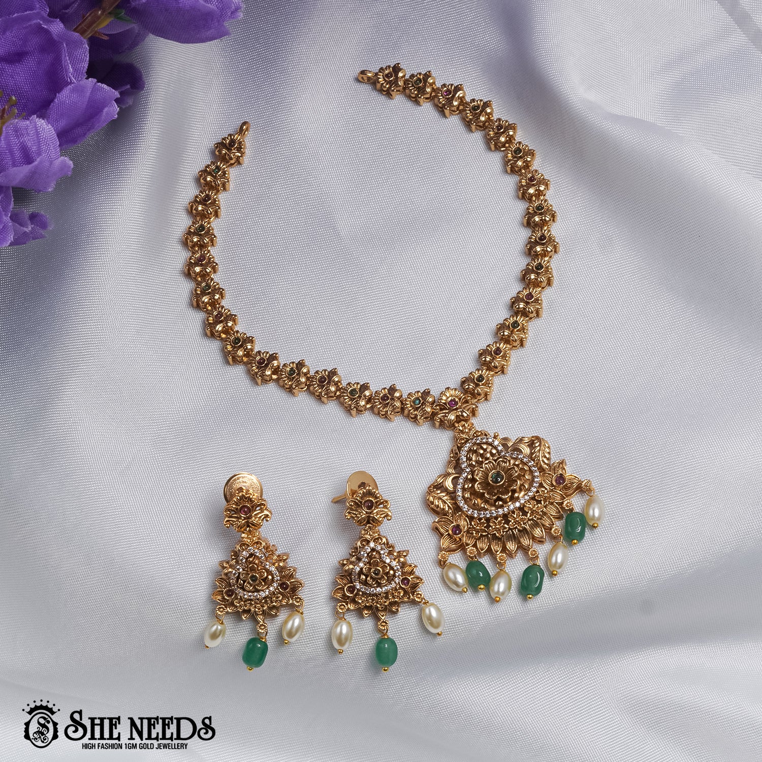 Grand lotus-inspired pendant with pearl and green stone danglers