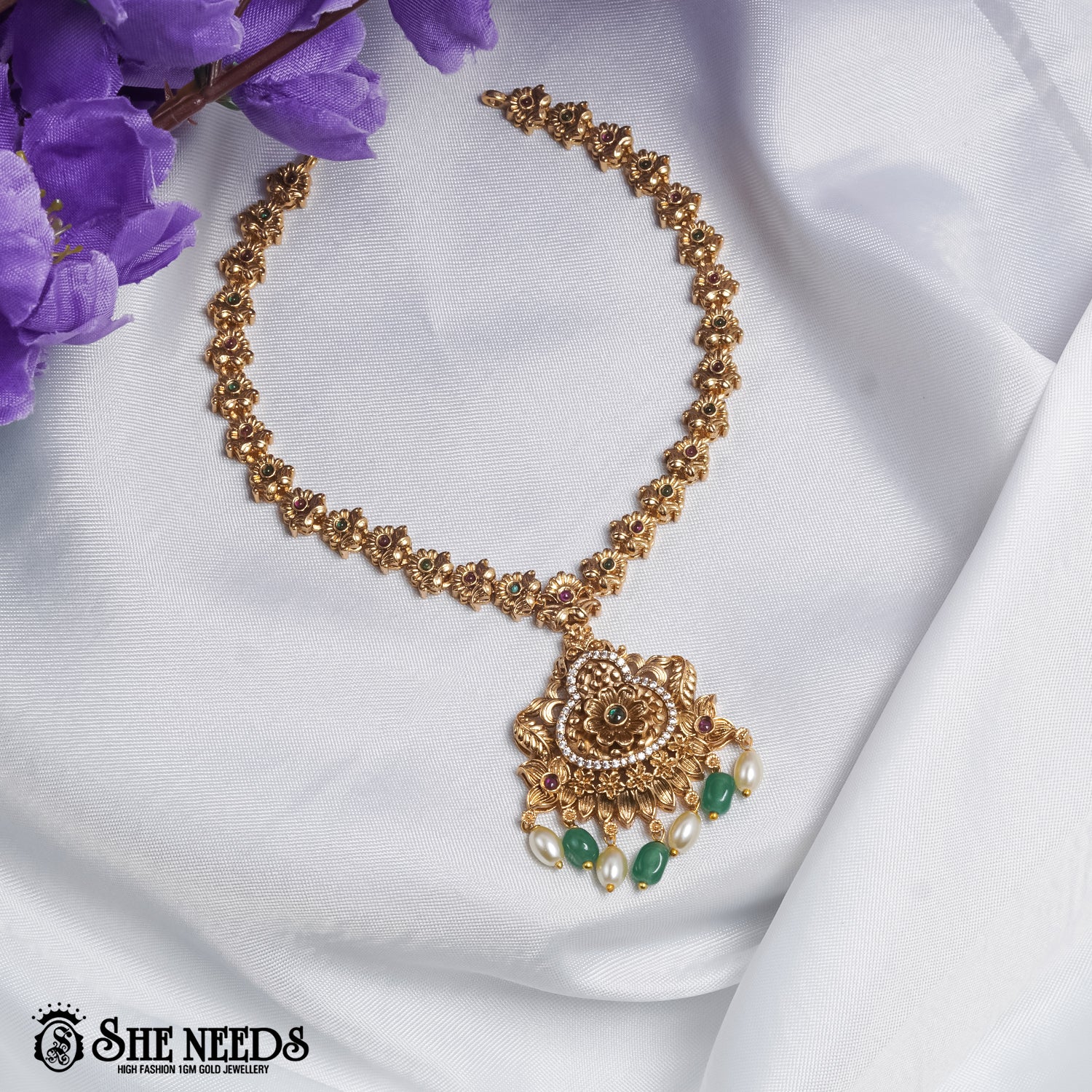 Step into a world of heritage elegance with the Regal Blossom Charm Necklace Set. Crafted in a radiant gold-toned finish, this necklace features a delicate floral chain and a grand pendant designed like a blooming lotus. Adorned with ruby-toned stones, classic motifs, and elegant green and pearl danglers, it reflects traditional opulence with a modern edge. Paired with matching earrings, this set is perfect for weddings, poojas, and festive celebrations.