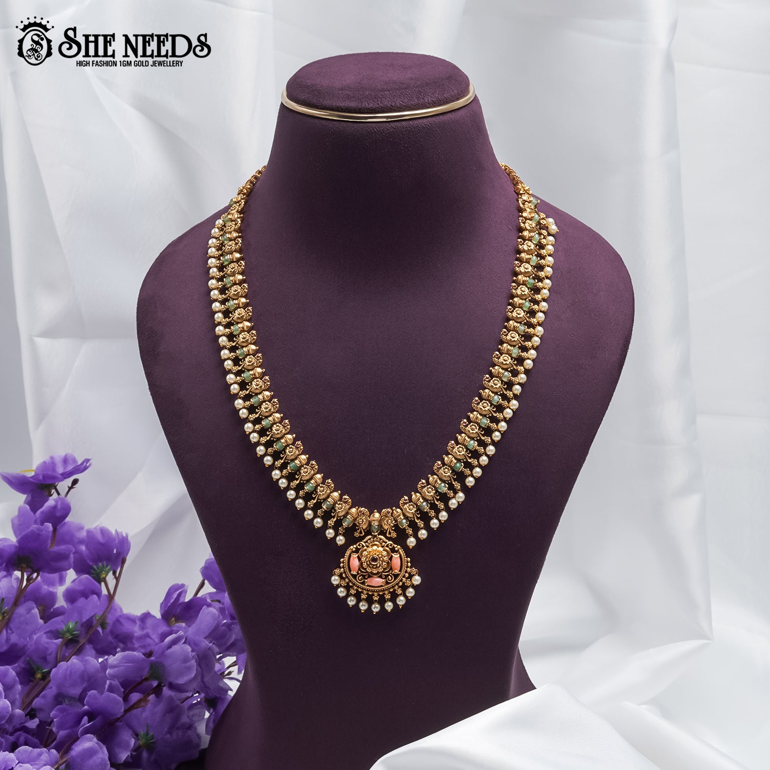 Embrace divine elegance with the Peach Blossom Radiance Necklace Set, a true celebration of traditional craftsmanship and delicate design. The necklace features a richly embellished gold-toned chain with intricate floral motifs, accented by pearl drops and pastel peach embellishments. A central pendant with floral engraving and lustrous pearls adds a refined charm. Paired with perfectly coordinated earrings, this set is designed to bring timeless beauty to weddings, poojas, and cultural festivities.