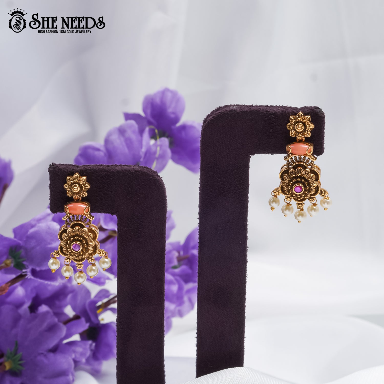The Peach Blossom Radiance Earrings are a graceful blend of tradition and elegance. Designed with a peach-toned floral element and pearl droplet detailing, these earrings perfectly echo the charm of the matching necklace. Ideal for festive gatherings or temple visits, they also make a subtle standalone statement.