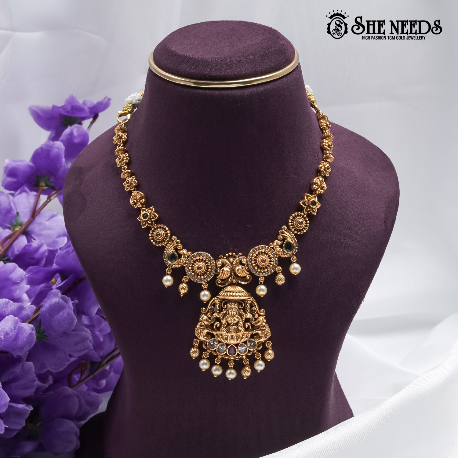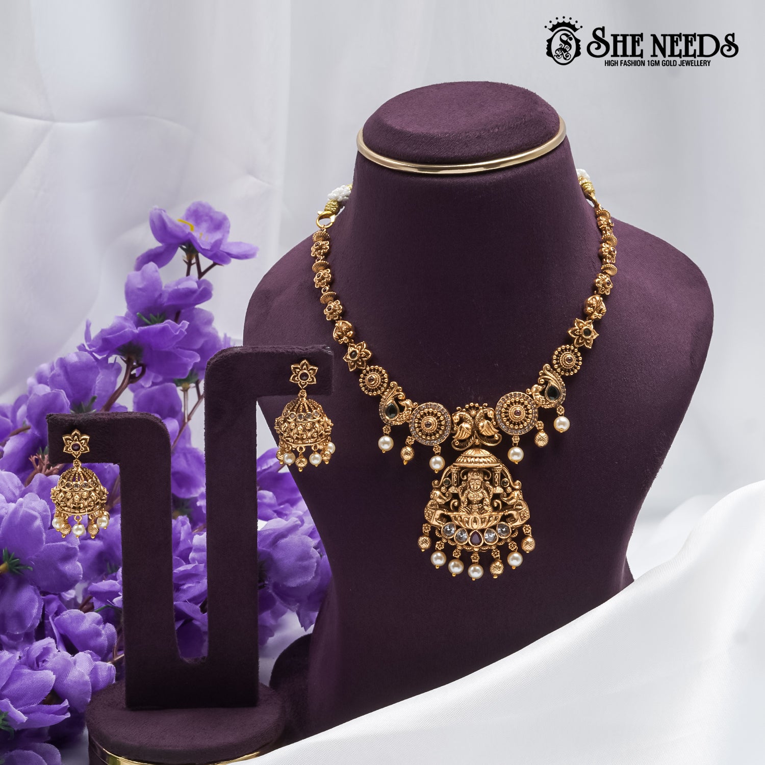 Embrace tradition with the Royal Lakshmi Temple Necklace Set, a divine piece that celebrates heritage and craftsmanship. Featuring a detailed goddess Lakshmi pendant, this antique gold-toned necklace is adorned with intricate temple motifs, ruby accents, pearl drops, and peacock-inspired designs. Perfect for festivals, weddings, or any spiritual celebration, this set radiates grace and cultural richness.