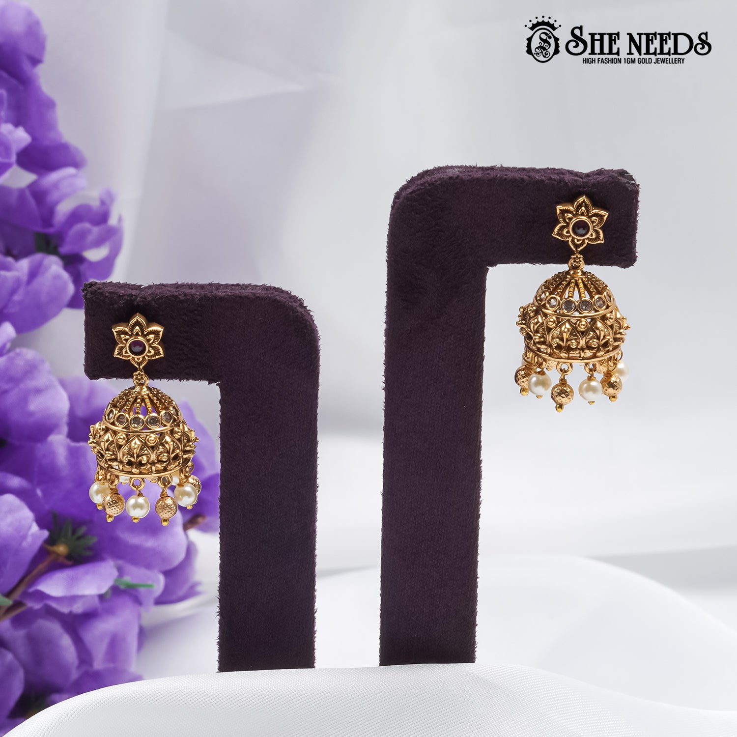Add divine elegance to your look with the Royal Lakshmi Temple Earrings. Designed in jhumka style with antique gold detailing, these earrings feature floral tops, traditional filigree work, and pearl hangings that echo the necklace design, completing your ethnic attire with sophistication.