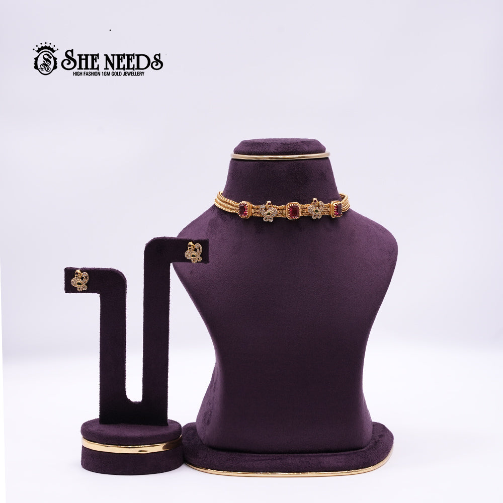 A sophisticated 1gm gold choker necklace set adorned with deep ruby stones and delicate floral AD motifs, offering a graceful yet majestic appeal perfect for formal and festive occasions.