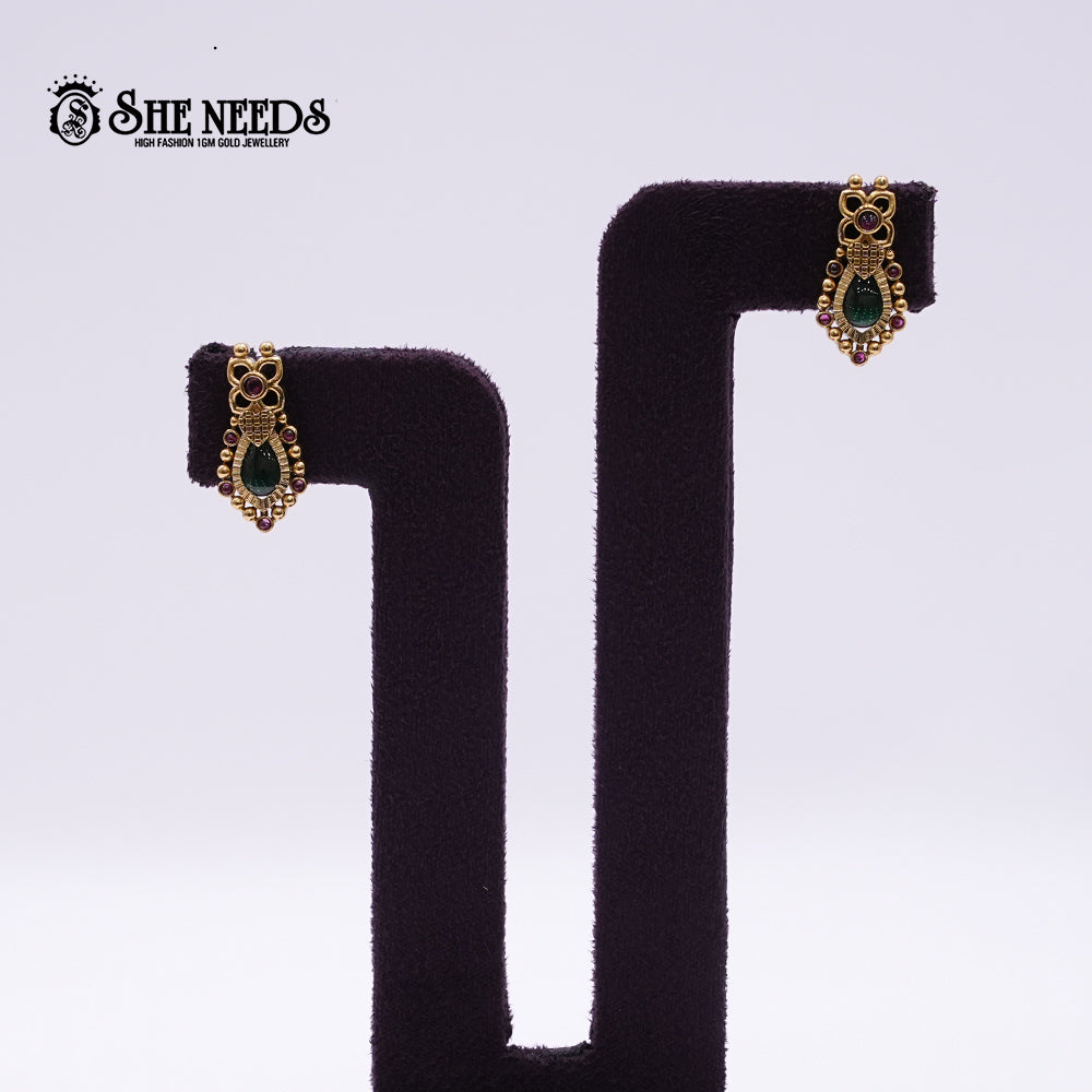 Elevate your ethnic charm with this exquisite Earrings and Necklace Set from She Needs. Featuring intricately detailed drop-shaped earrings with green teardrop stones and a perfectly matched necklace with antique detailing, this set is an embodiment of timeless grace. Ideal for traditional occasions, it adds a subtle yet sophisticated statement to your ensemble.