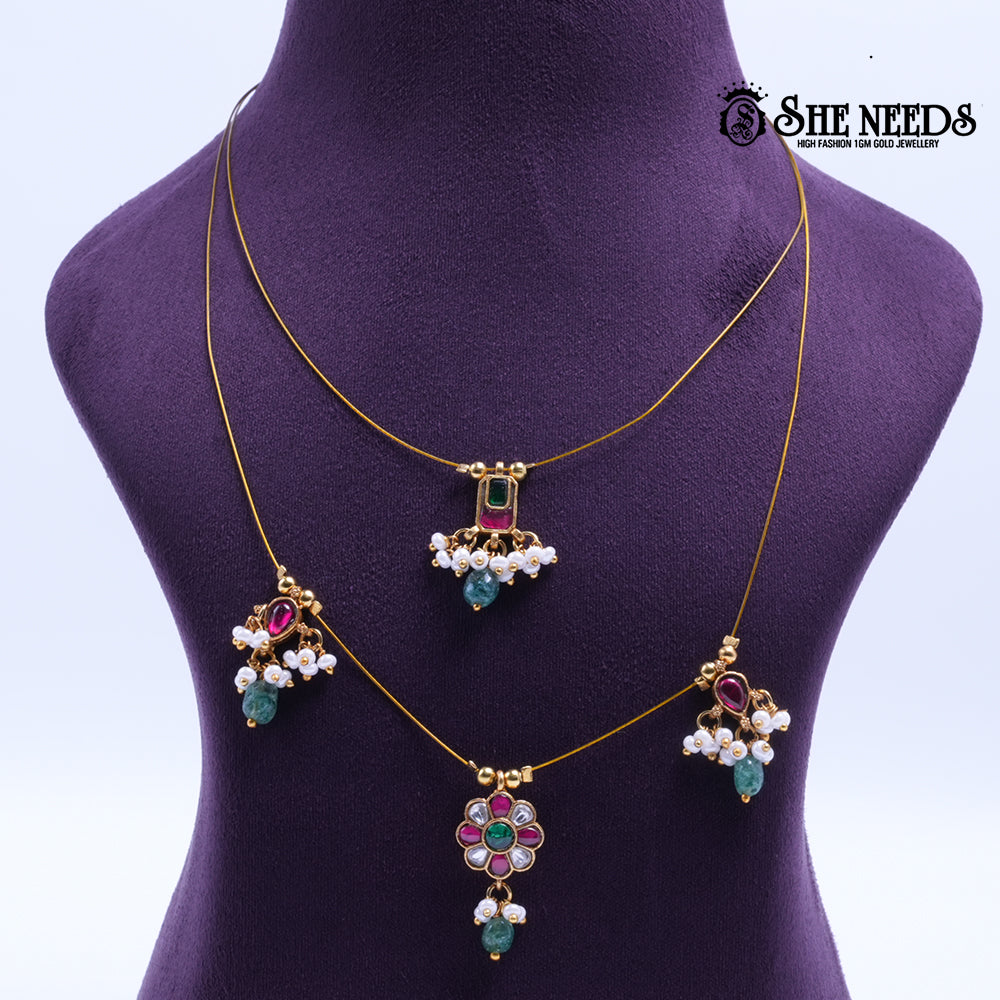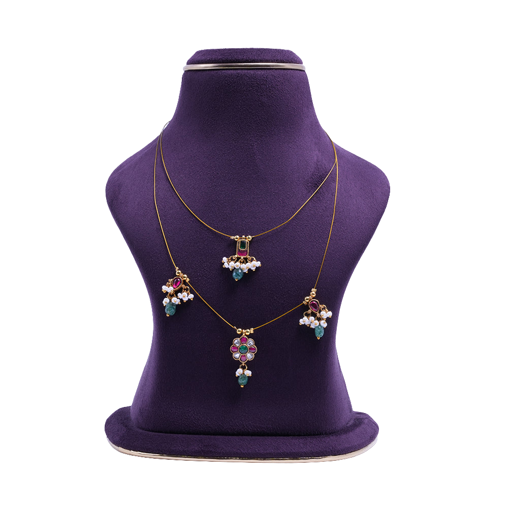 Royal rani haar necklace featuring ruby and emerald stones, clusters of petite pearls, and gold finish pendants on delicate layered chains.