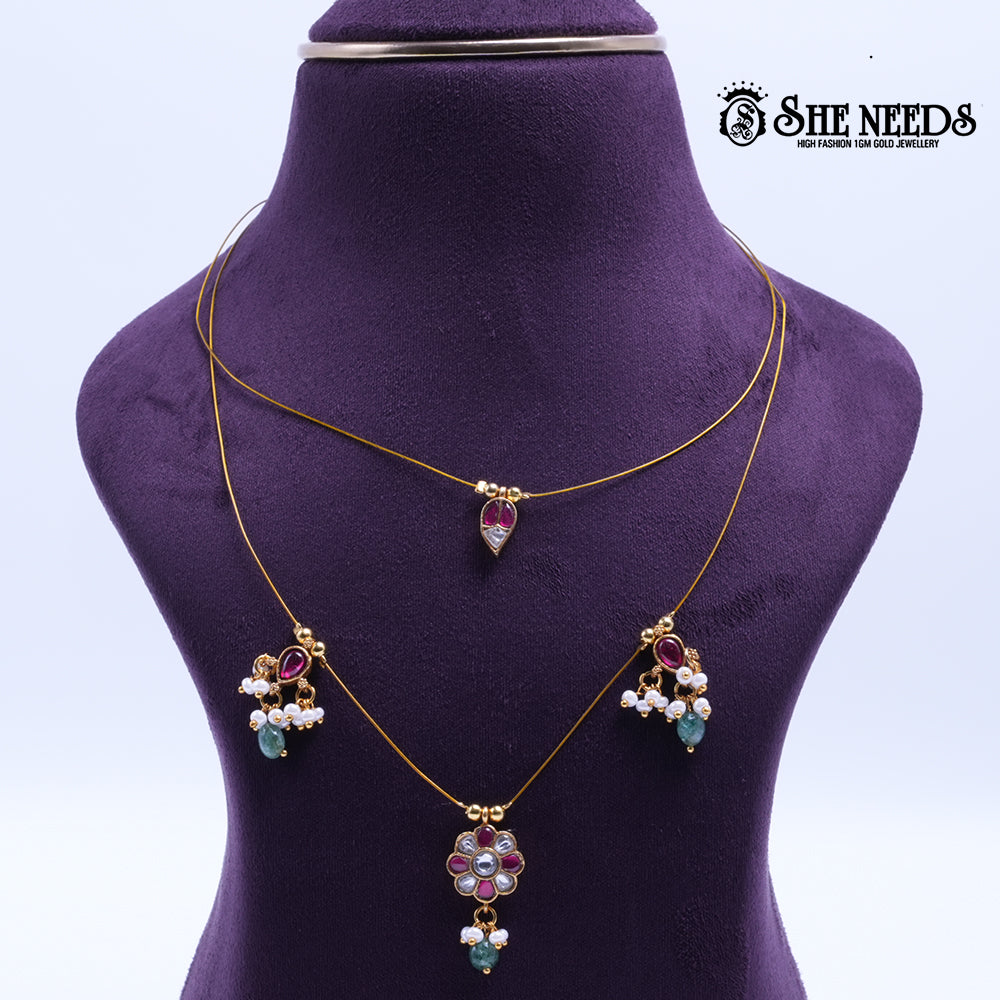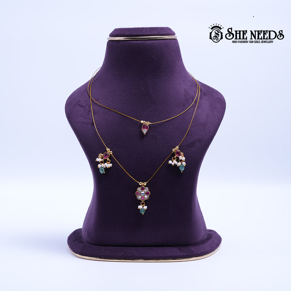 Two gold-string layers adorned with ruby, pearl, and emerald drop pendants