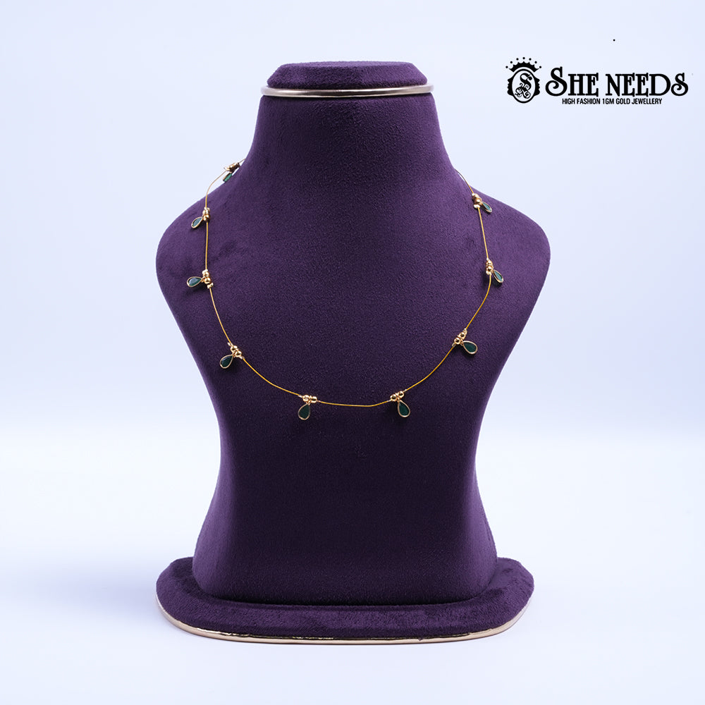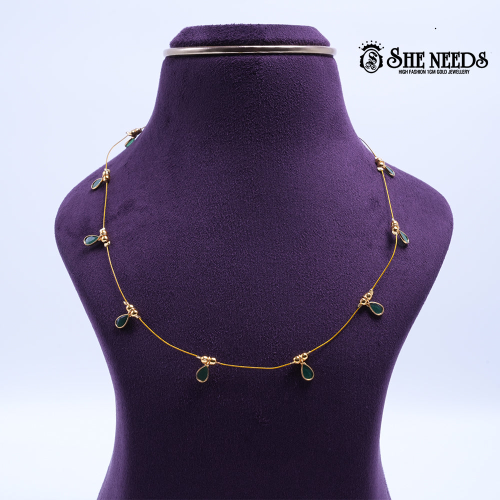 Minimal and elegant necklace featuring a fine gold string adorned with small, teardrop-shaped emerald green charms for a delicate touch of color.