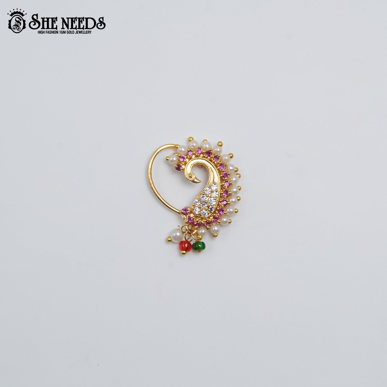 Celebrate tradition with a twist of sparkle in the Paisley Pearl Nath. Designed in a graceful paisley silhouette, this elegant piece is adorned with a cluster of brilliant CZ stones, a border of pink crystals, and dainty white pearls. The finishing touch comes from vibrant red and green bead danglers, adding a festive pop of color to this timeless design.