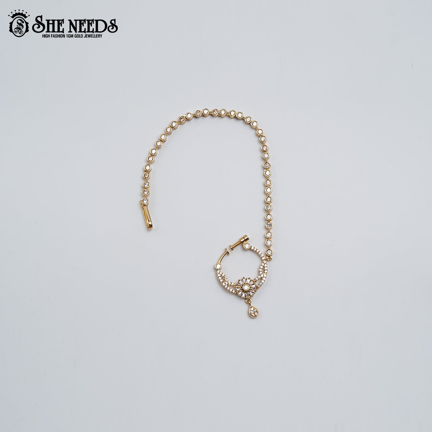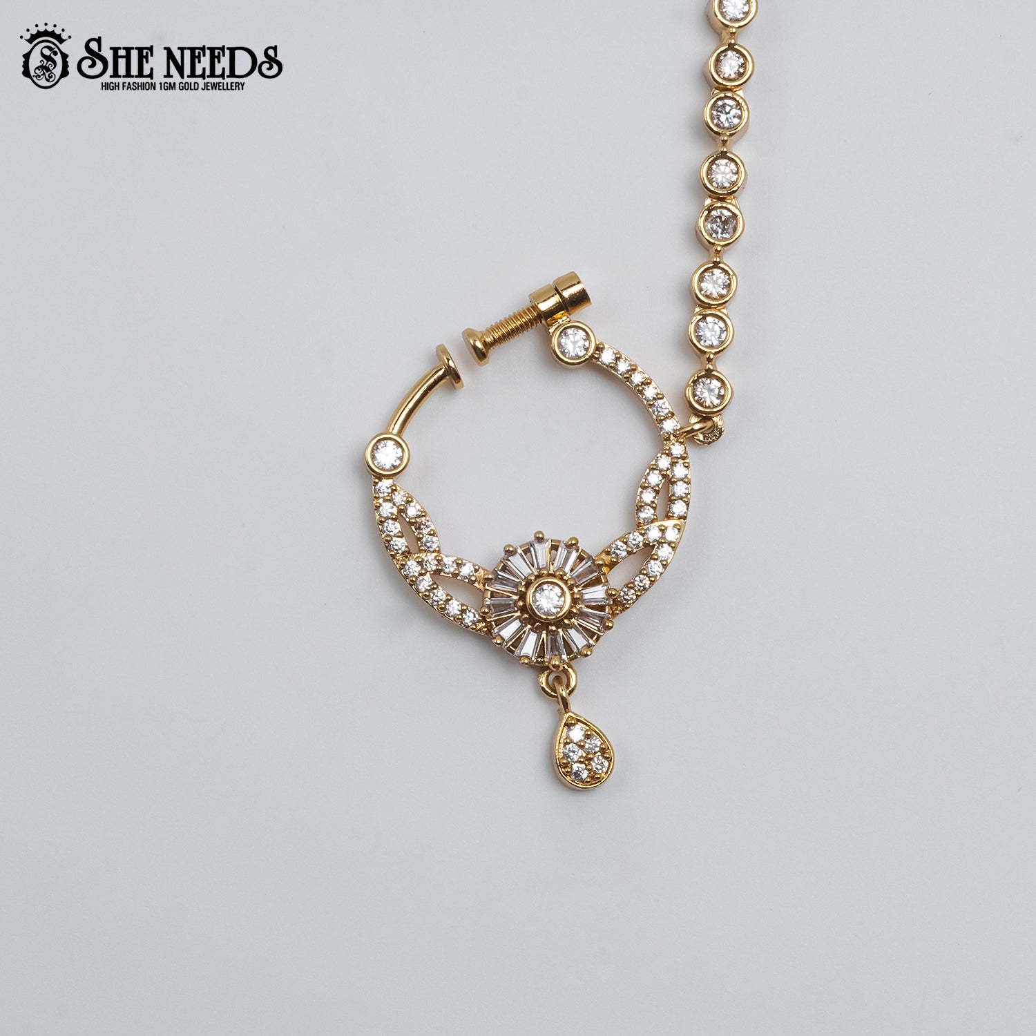 Add a touch of vibrant tradition to your look with the Paisley Bloom Nose Ring. Crafted in a graceful paisley shape and adorned with shimmering white CZ stones and radiant pink accents, this piece is surrounded by dainty pearls and finished with playful red and green drops for a festive charm.