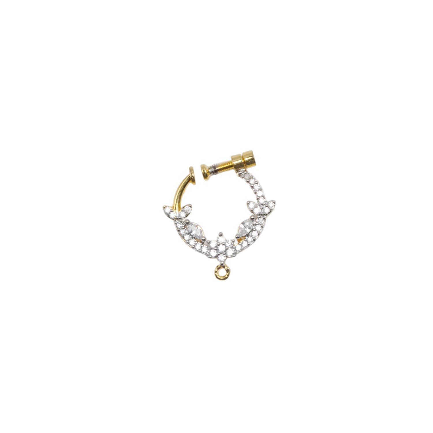 Grace your look with the refined elegance of the Crystal Vine Nose Ring. Designed with a graceful vine-inspired arc, this piece is studded with dazzling white CZ stones and marquise-cut crystals. The golden screw-style closure ensures a secure fit, while the central loop allows for additional charms, giving it a touch of versatility.