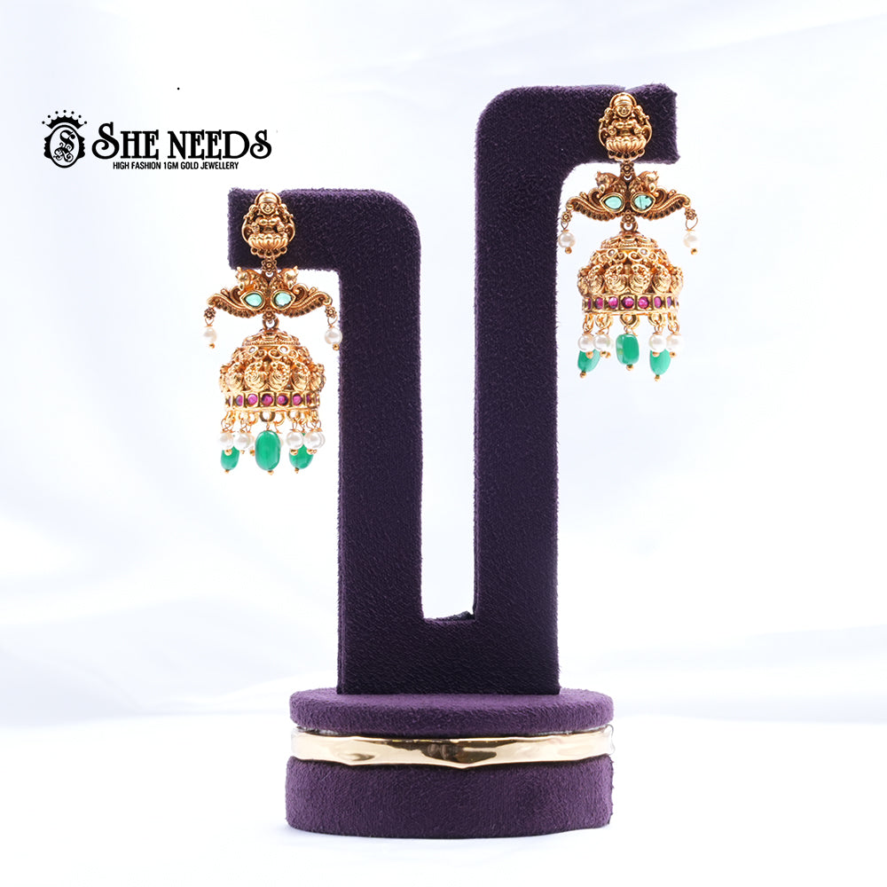 - Features: Lakshmi and peacock motifs, hand-detailed filigree, green beads, jhumka earrings