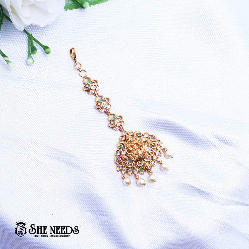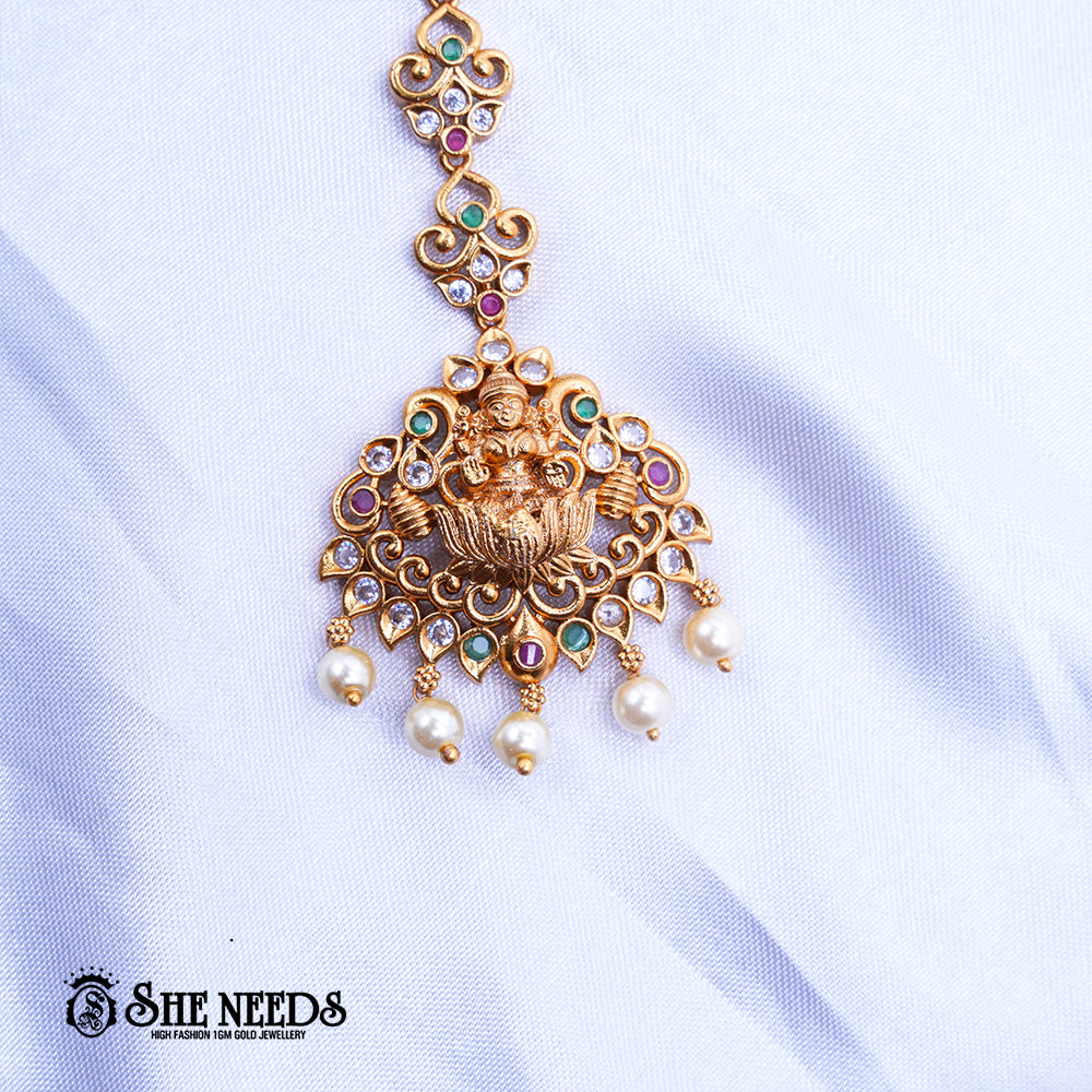 This traditional maang tikka radiates divine opulence with a central Lakshmi motif surrounded by ruby, emerald, and CZ accents on a filigree backdrop. The closely packed lotus petal arrangement, curving scrollwork, and lustrous pearl drops reflect South Indian bridal heritage and spiritual elegance.