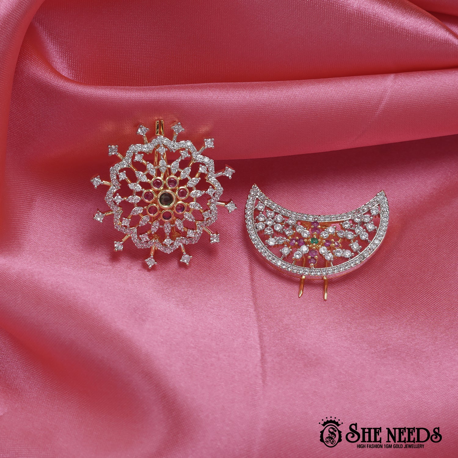 Radiating elegance, the Pendent set is a masterpiece in 1gm gold finish. Adorned with intricate floral and crescent motifs, sparkling white stones, and colorful gems, these designs are beautifully enhanced for a dazzling charm. The luxurious detailing and brilliant craftsmanship make this Pendent set the perfect blend of tradition and sophistication.
