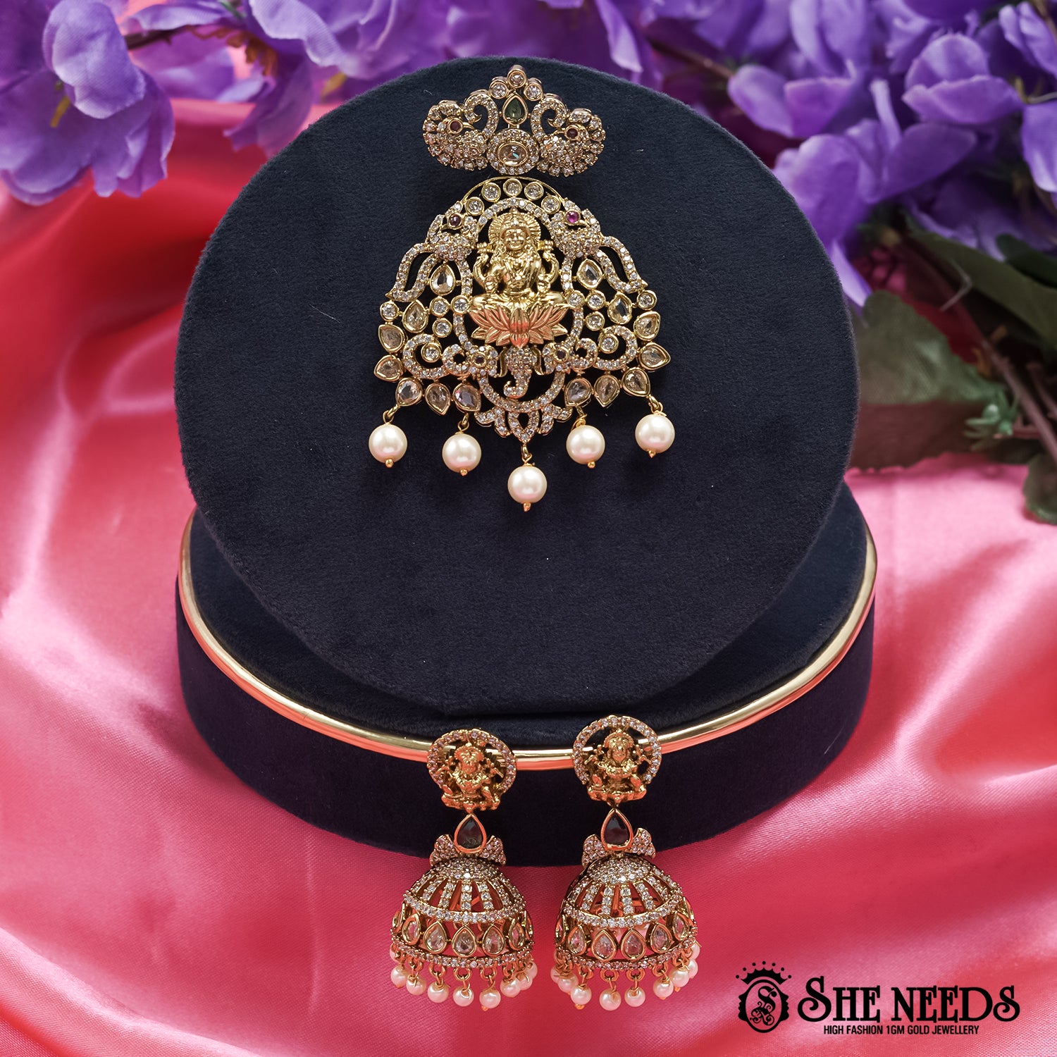 Radiating elegance, the Lakshmi Pearl Jhumka Set is a masterpiece in 1gm gold finish. Adorned with divine motifs of Goddess Lakshmi, shimmering white stones, and layered with lustrous pearl drops, this exquisite set celebrates spiritual beauty and traditional craftsmanship. The distinctive design blends classic temple jewellery artistry with festive sophistication.
