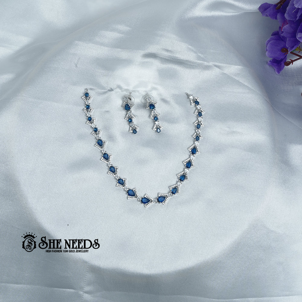 - Features: Emerald-green stones, CZ-outlined geometric links, dangling teardrop emerald drops on earrings, lightweight necklace and danglers