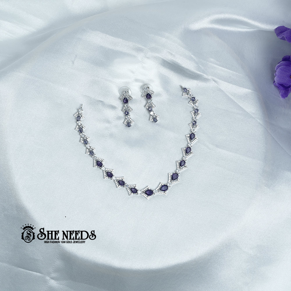 This striking necklace set features vivid emerald-green stones framed in CZ halos and arranged in a modern zig-zag prism pattern. Matching linear earrings with teardrop emerald drops complete the look with sleek, elongated sparkle.
