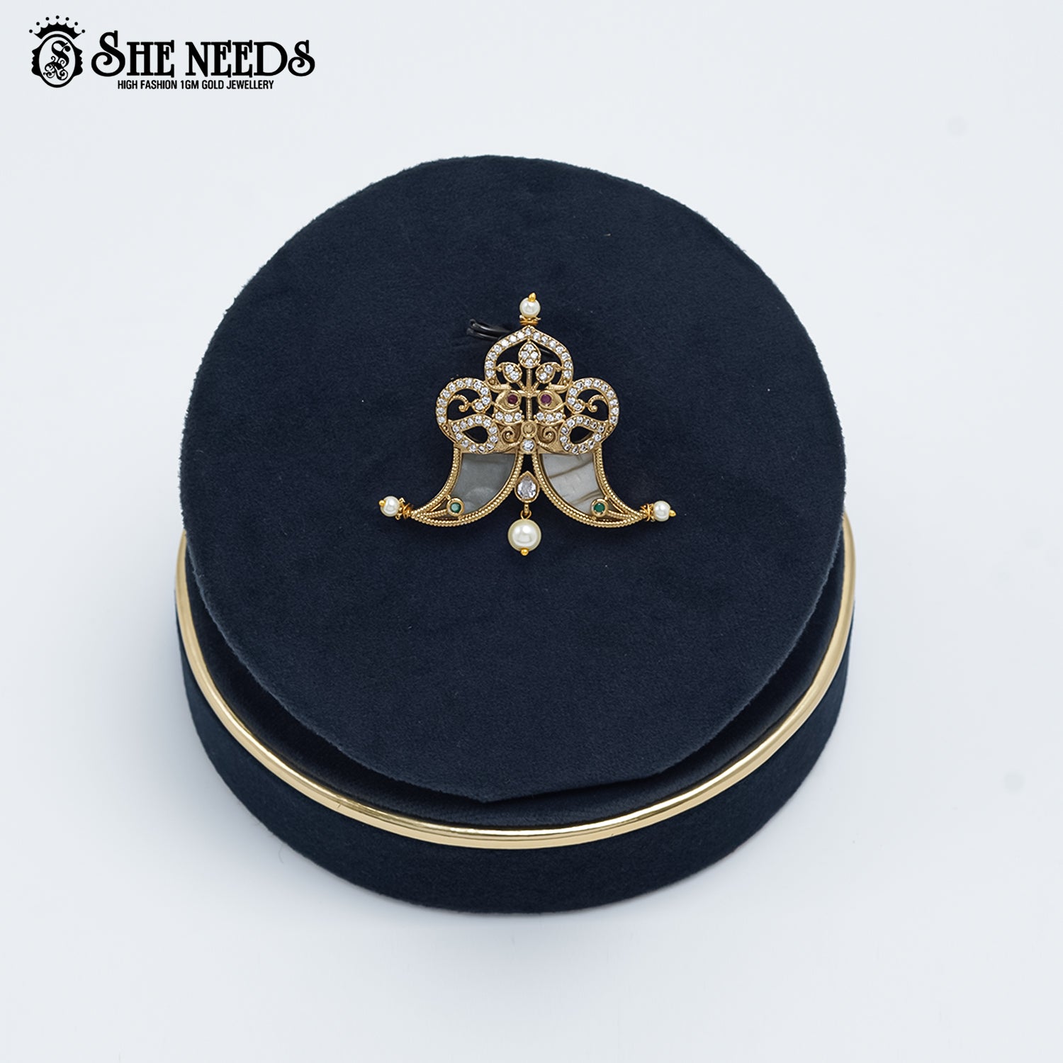 Enhance your ethnic charm with this Elegant Floral Tikka, crafted in a radiant 1gm gold finish. Designed with intricate floral and swirl patterns, it is embellished with sparkling CZ stones and accented with tiny emerald-green details. The delicate pearls add a graceful touch, making it a versatile accessory for weddings, engagements, and festive occasions.