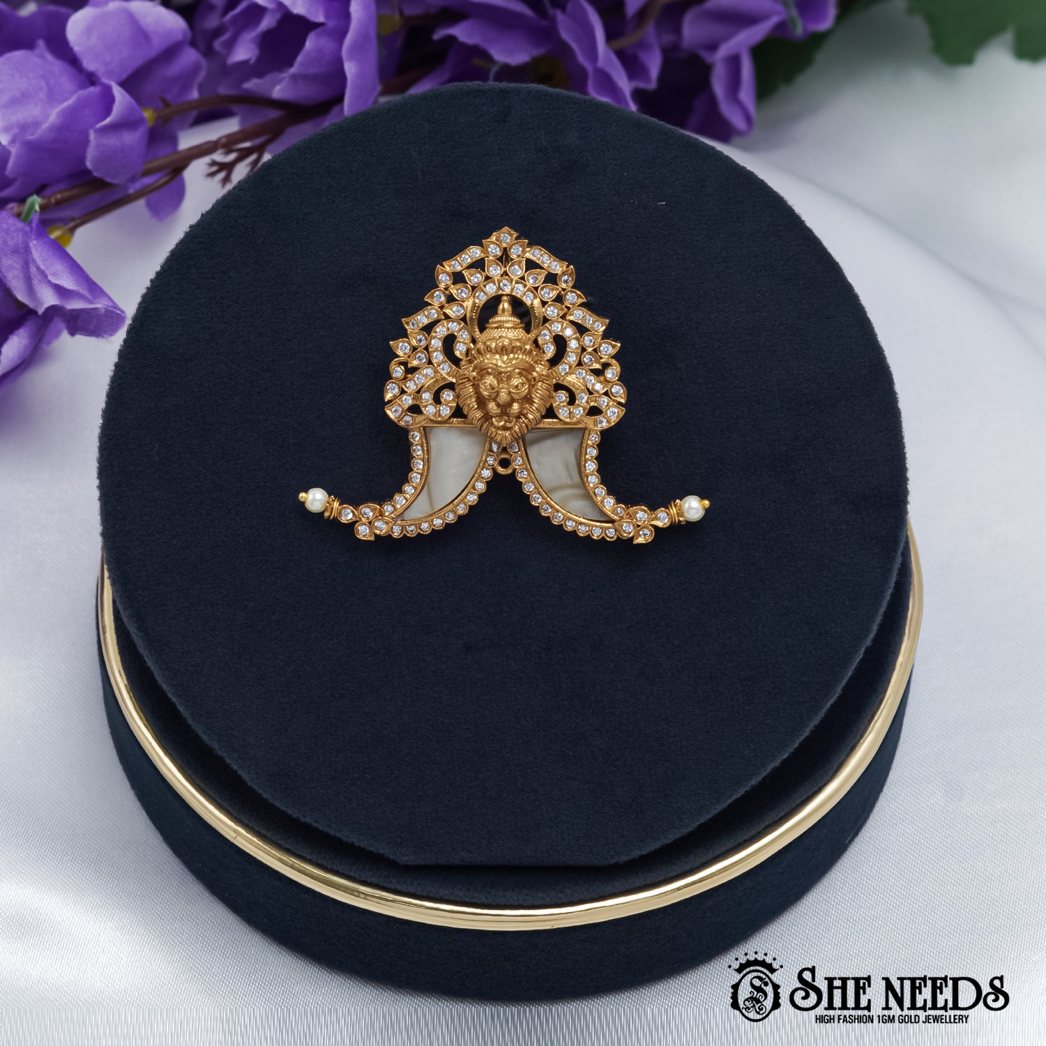 Radiating grandeur, the Regal Lion Motif Brooch is a masterpiece in 1gm gold finish. Adorned with a majestic lion centerpiece, shimmering white stones, and elegant shell-like accents, this exquisite brooch is further highlighted with delicate pearl ends. The detailed craftsmanship and bold design make it a striking blend of tradition and royalty.