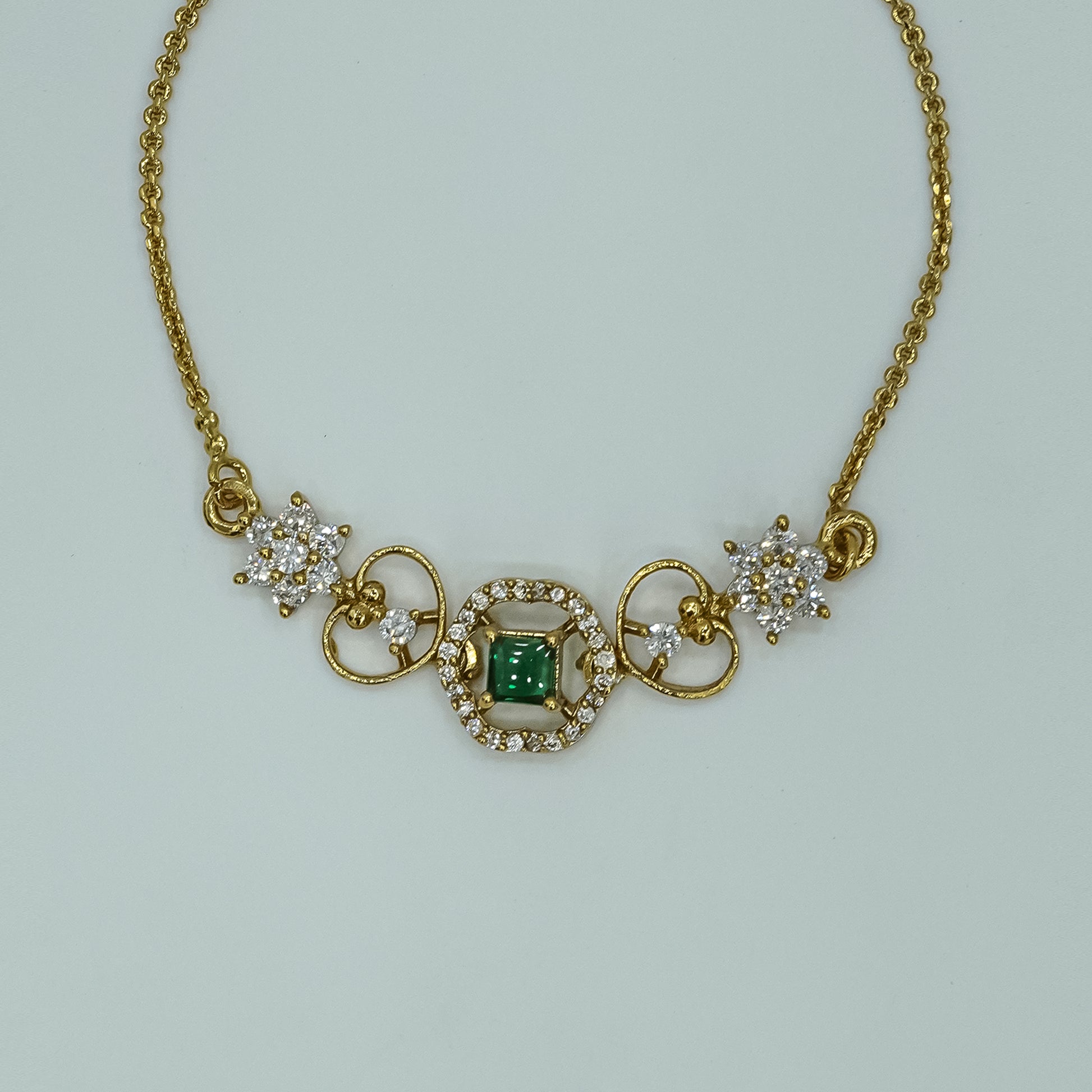 This elegant bracelet features a stunning centerpiece adorned with a vibrant emerald-green stone surrounded by sparkling white crystals. Delicate floral motifs and swirled golden accents add an air of sophistication, making it a versatile piece to complement both ethnic and contemporary ensembles.